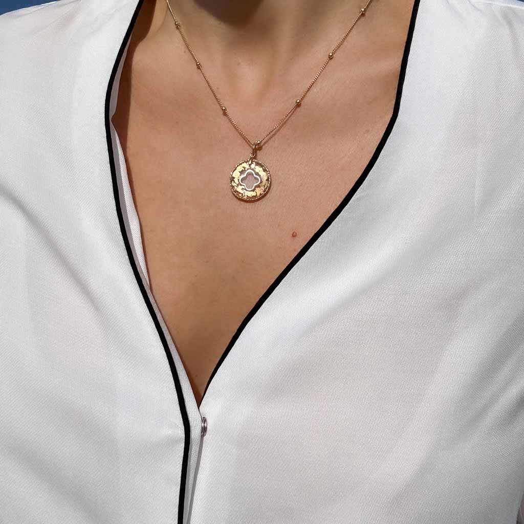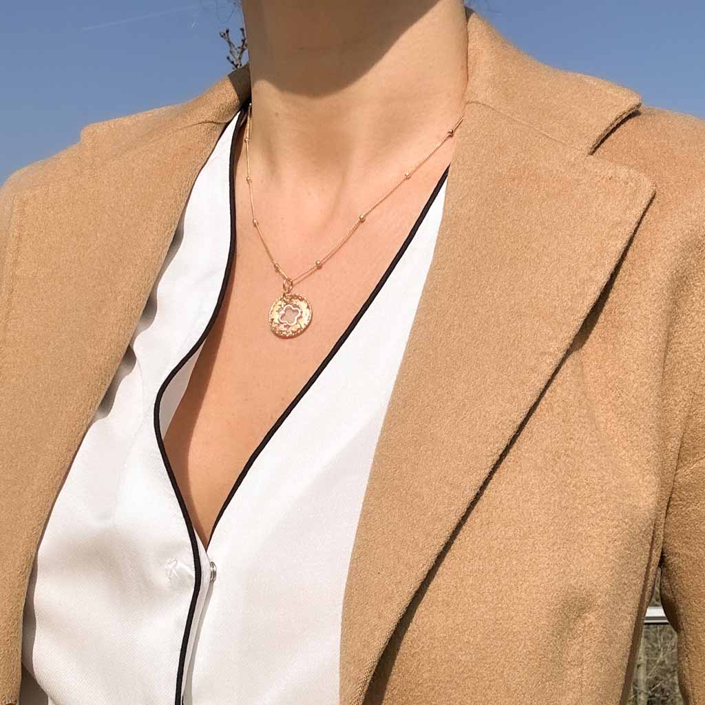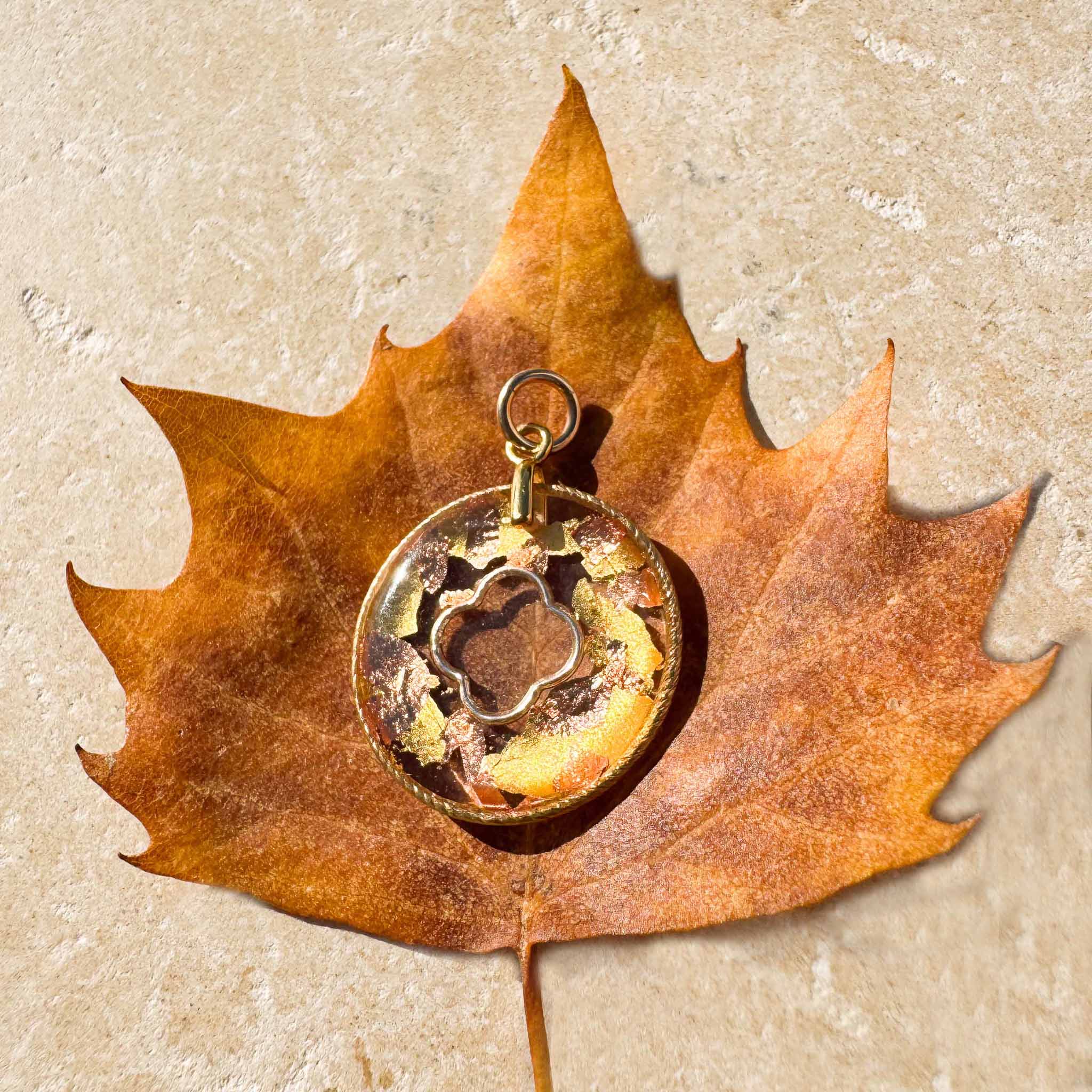 Gold-plated, diamond-filled 7/8 in. medal, openwork silver cross, gold and copper leaf. Shown here on the Elisabeth chain.