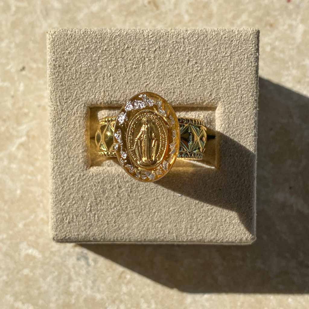 The ring is open under the finger and therefore fits sizes 52 to 58 (no smaller or larger). It is sent in an organza bag. Naturalgiftbox available as an option. Gold-plated miraculous medallion, silver leaf, resin. Good news: your wedding ring can fit under the cabochon!