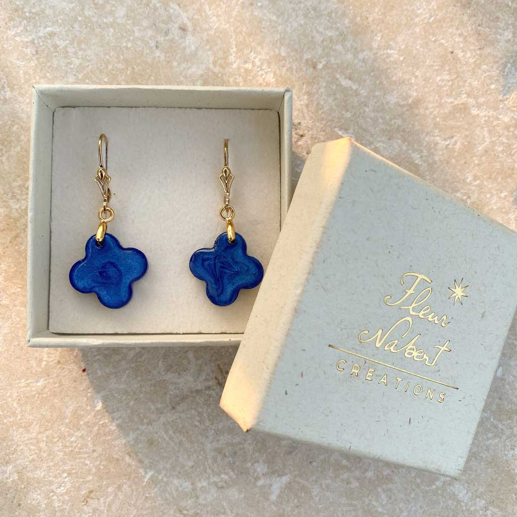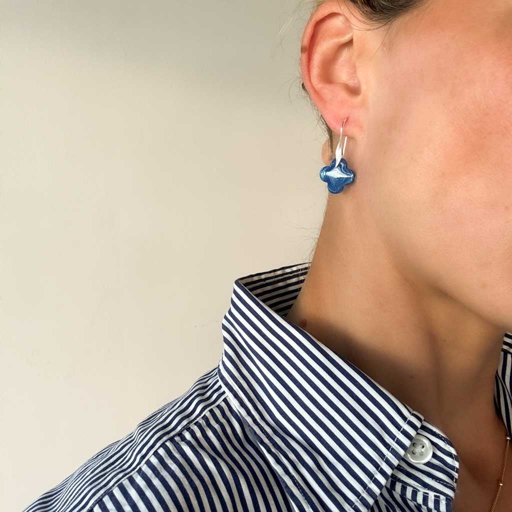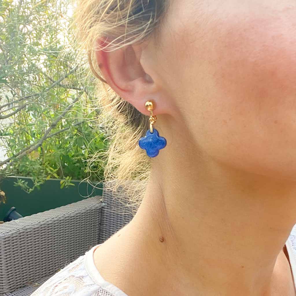 If you'd like to create a "celestial" set, you'll receive a 15% discount with the code PARURE to add to your cart. Four-lobed crosses, 1.5 cm high and 1.5 cm wide. The slightly sparkling blue mica inside will always vary a little and have its own poetry. Gold- or silver-plated setting, for pierced ears or clips.