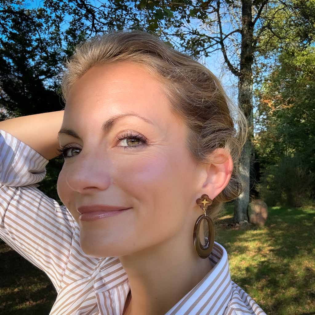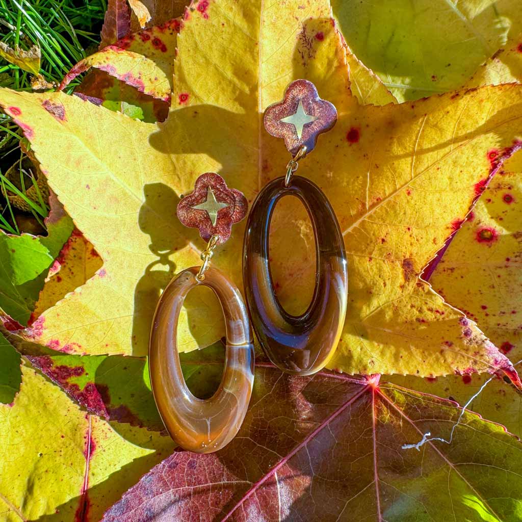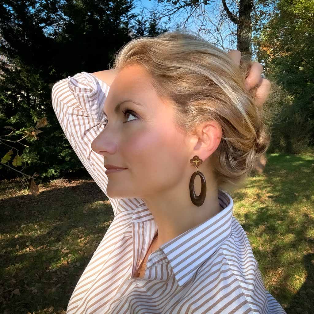 The chocolate earrings feature a pair of four-lobed cross stud earrings. Made of slightly shimmering chocolate-colored resin and mica, they include a brass cross in their center. Two large opaque chocolate resin hoops with fine beige marbling effects complete the pair. CThese earrings are not adaptable as clips. The stud earrings are made of hypoallergenic stainless steel and come with a butterfly clasp and a silicone stopper. We recommend wearing both together.
