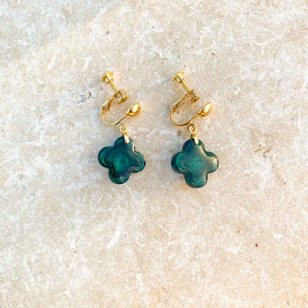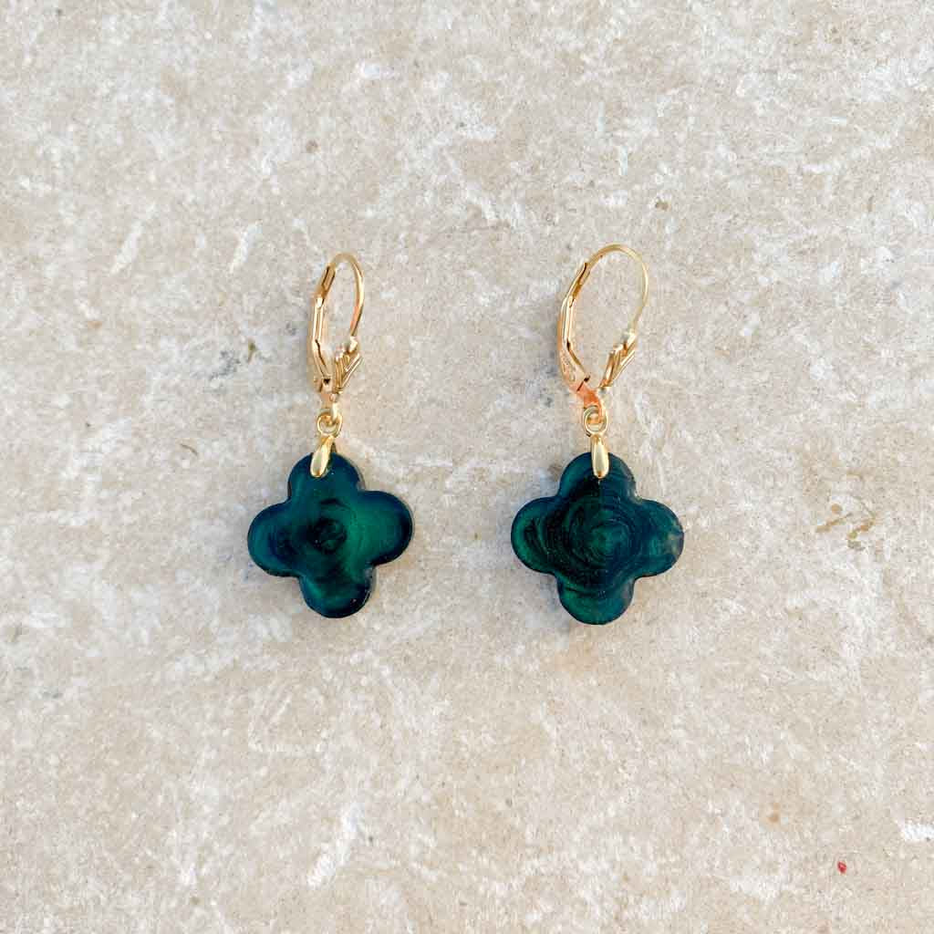 A jewel I'm pleased to offer you mounted on gold plating. This model is also availableas a cross pendant, to create the set. Four-lobed crosses, 1.5 cm high and 1.5 cm wide. The deep green, slightly sparkling mica inside will always vary a little and have its own poetry. Gold-plated setting, for pierced ears or clips.