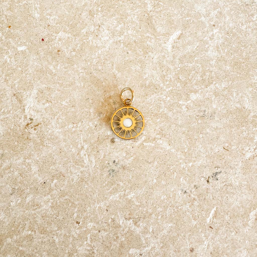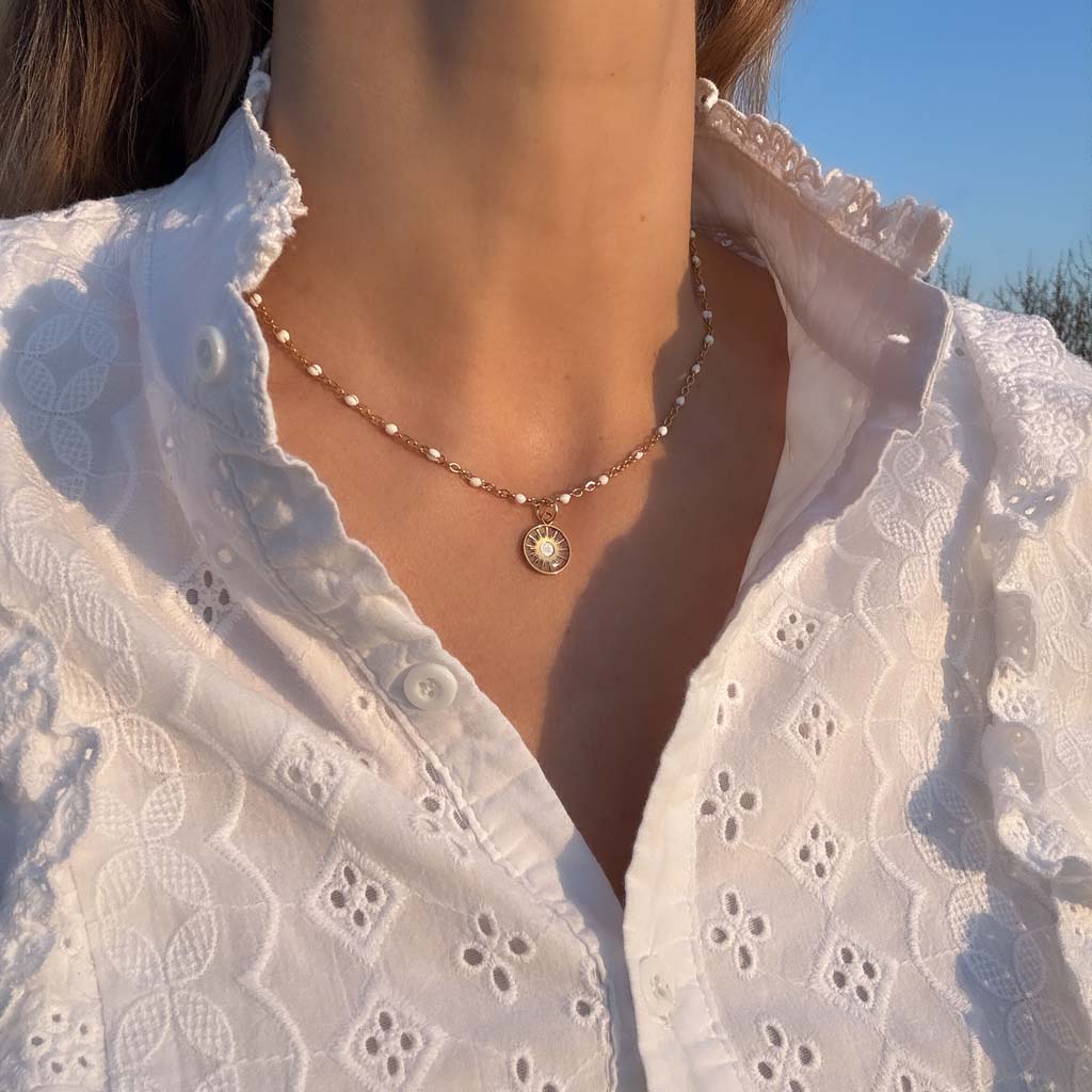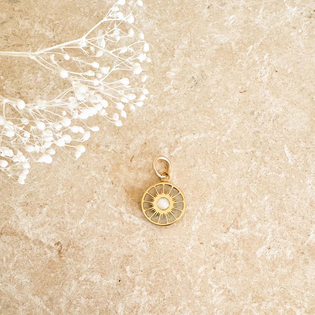 Hand-crafted jewel, small compass medal in stainless steel, 10 mm (3/8 in.) in diameter (note that this is a small-sized jewel that I love precisely for its precious discretion), heart in white pearly mica. To preserve the brilliance of your jewel, we recommend keeping it away from water and perfume, and storing it in a box when not in use.