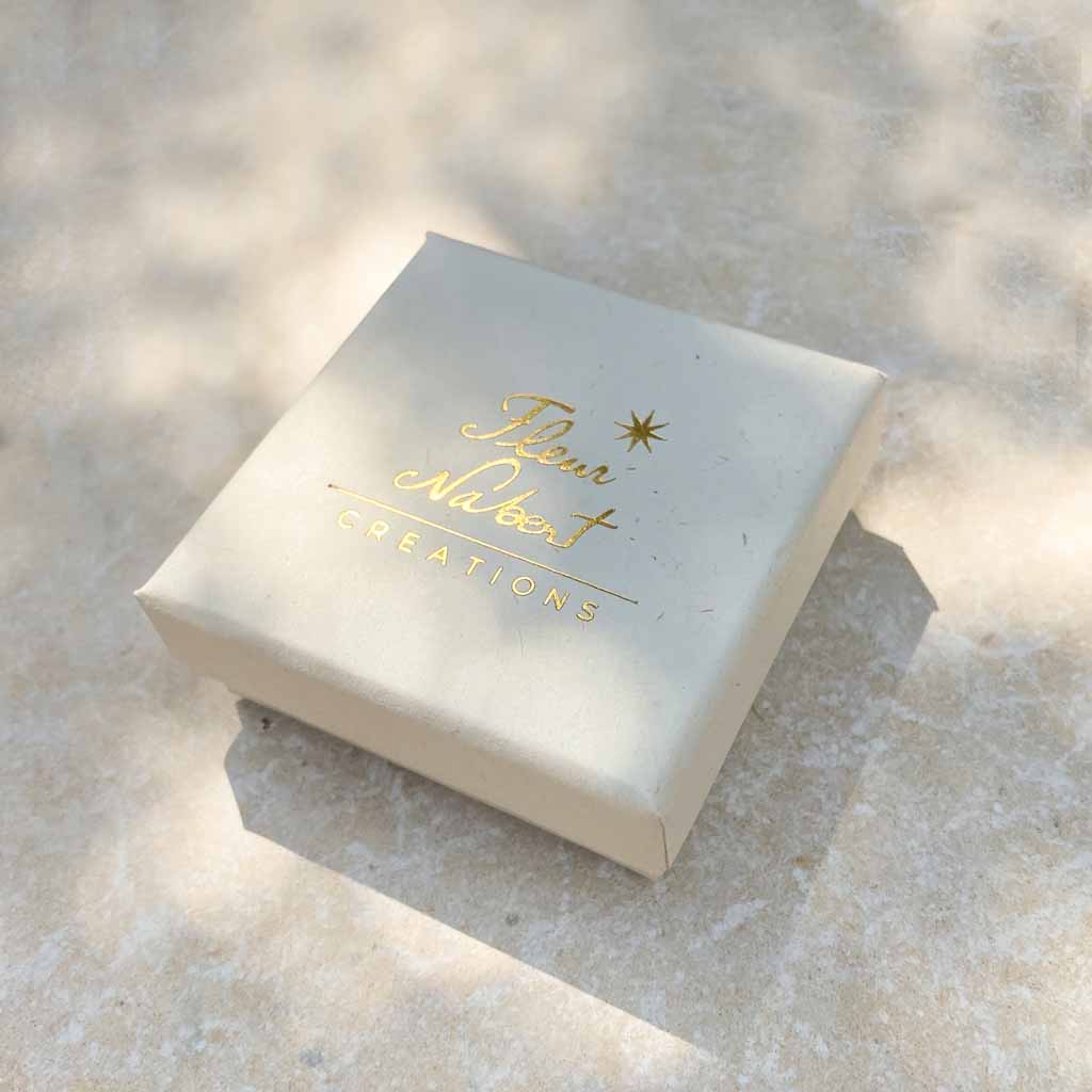 It's made of natural cardboard, measures 5.5 x 5.5 x 2.2 cm and will itself be slipped into an organza pouch and decorated with a plant element, the signature of all my creations.
