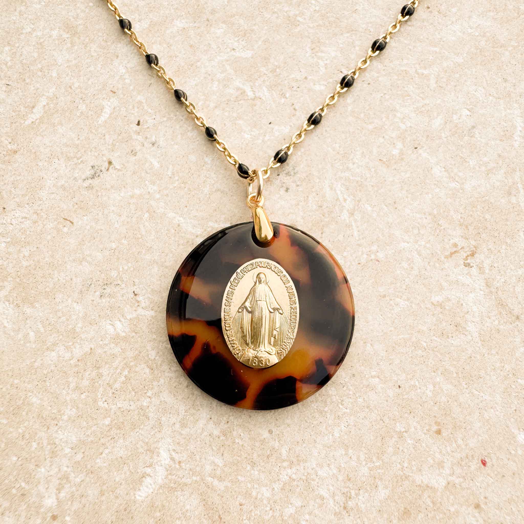 Hand-crafted jewelry, imitation tortoiseshell sequin 3 cm in diameter (no tortoiseshell is brutalized!), rue du Bac miraculous medal. 3-micron gold-plated hanger and ring. As the photos show, the sequins are all slightly different, retaining the charm of genuine tortoiseshell.