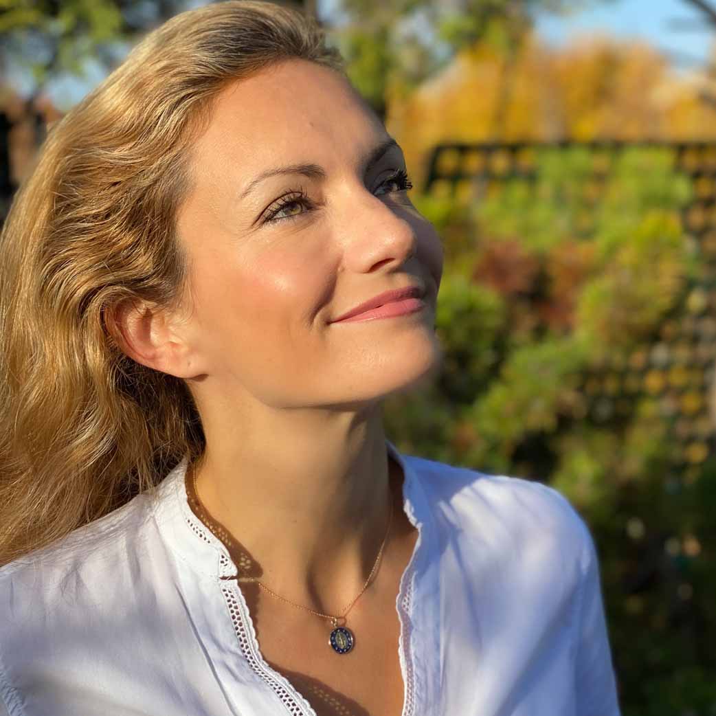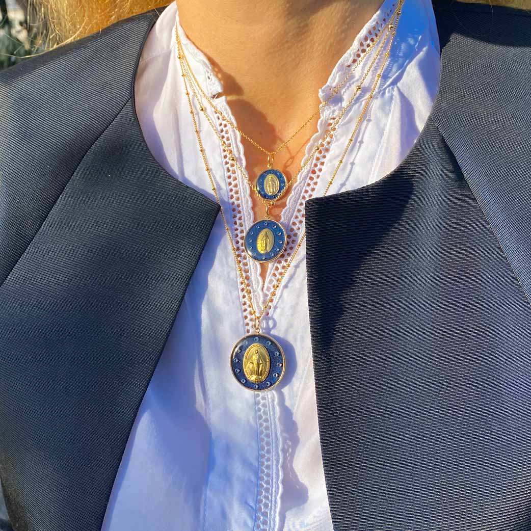 The medal comes in three sizes, as you can see in the photo. Here it's the MINI 16 mm version (on the right in the first photo and the smallest when I'm wearing all three - in blue on the photo but the size is the same in green), discreet to wear as a necklace here on the Jeanne chain or as a bracelet. It also comes in the classic 20 mm medal size, which is still quite discreet, and the large 25 mm size, which is radiant.