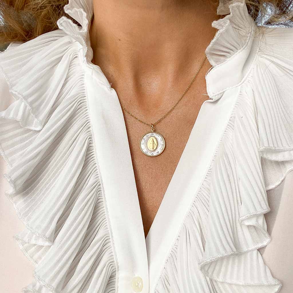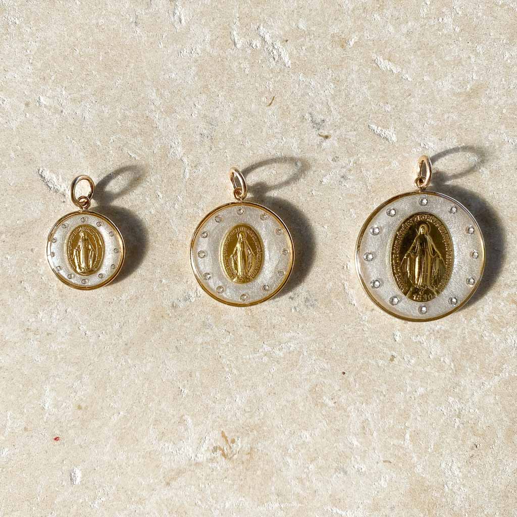 The Miraculous Medal crowned with blue stars is a true best-seller. For the upcoming Christmas, I have crafted it in a magnificent pearly white, as pure as morning snow. It is still a small technical feat: working with very fine glitter AND allowing the back of the medal to remain visible. It is a long and complex piece of jewelry to create (which explains its slightly higher price.) But its light and Marian majesty fill me with joy.