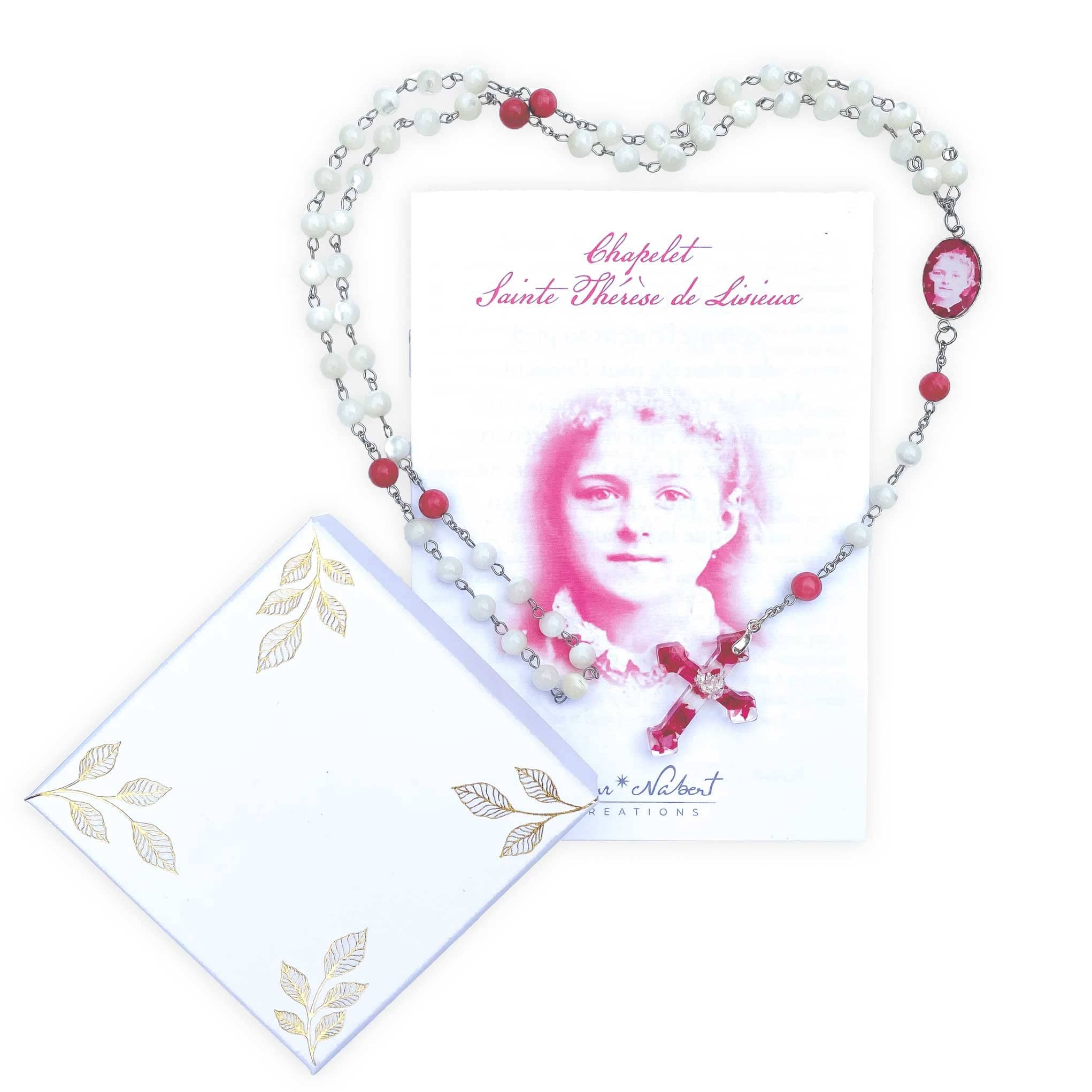 Rosario in madreperla e rodonite da 6 mm, creazioni di petali di rosa, resina e oro bianco. Lunghezza del rosario 45 cm. Inviato in una confezione regalo (non è necessario aggiungerne una, è inclusa), con una bustina di organza e un libretto esplicativo con le parole di santa Teresina sulla preghiera del rosario.