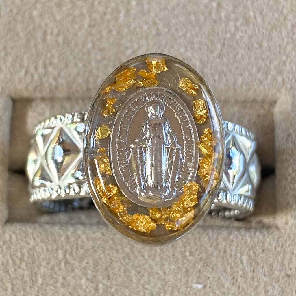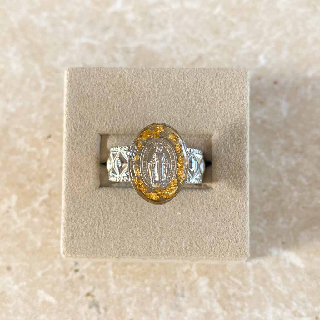 L'anello è aperto sotto il dito ed è quindi adatto alle taglie dalla 52 alla 58 (non di più né di meno). Viene spedito in un sacchetto di organza. Lascatola di colore neutro può essere acquistata come opzione. Medaglia miracoloso argentata, foglia d'oro 24 carati, resina. Buone notizie: la fede nuziale può essere infilata sotto il cabochon!