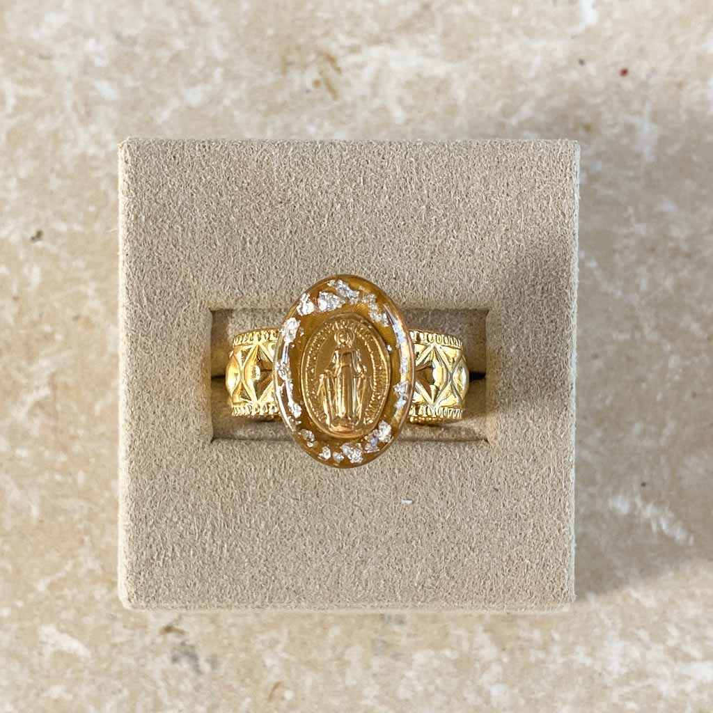L'anello è aperto sotto il dito ed è quindi adattabile per le misure dalla 52 alla 58 (nè meno né più). Viene spedito in un sacchetto di organza. Lascatola color neutro può essere acquistata come opzione. Medaglia miracolosa placcata d'oro, foglia d'argento, resina. Buone notizie: la fede nuziale può essere infilata sotto il cabochon!
