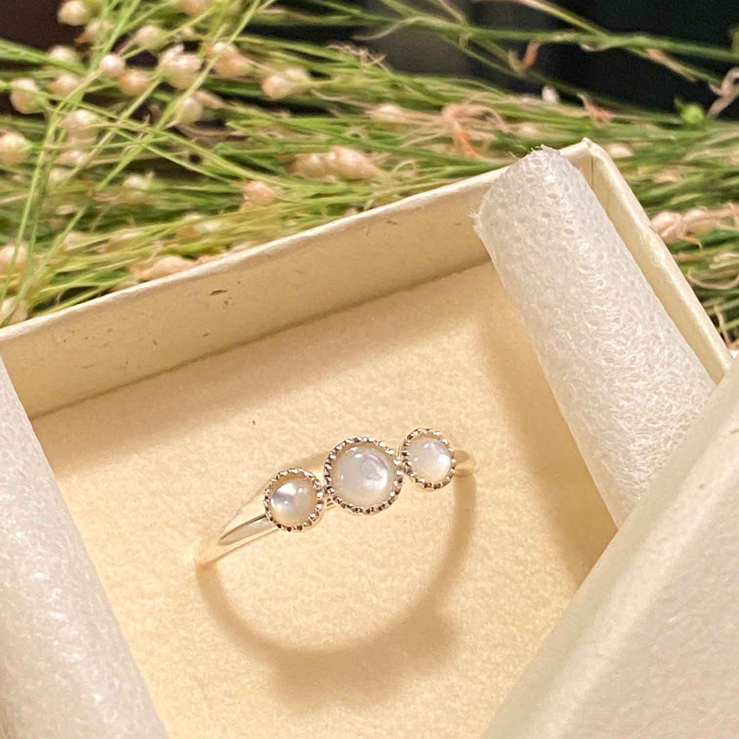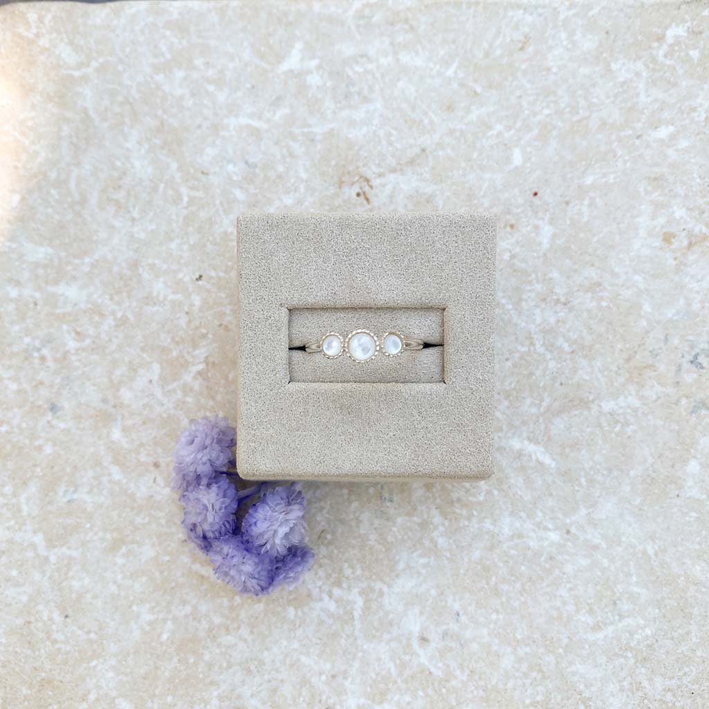 L'anello è disponibile in diversi colori, in questo caso bianco puro in madreperla naturale, come un riflesso della grazia.