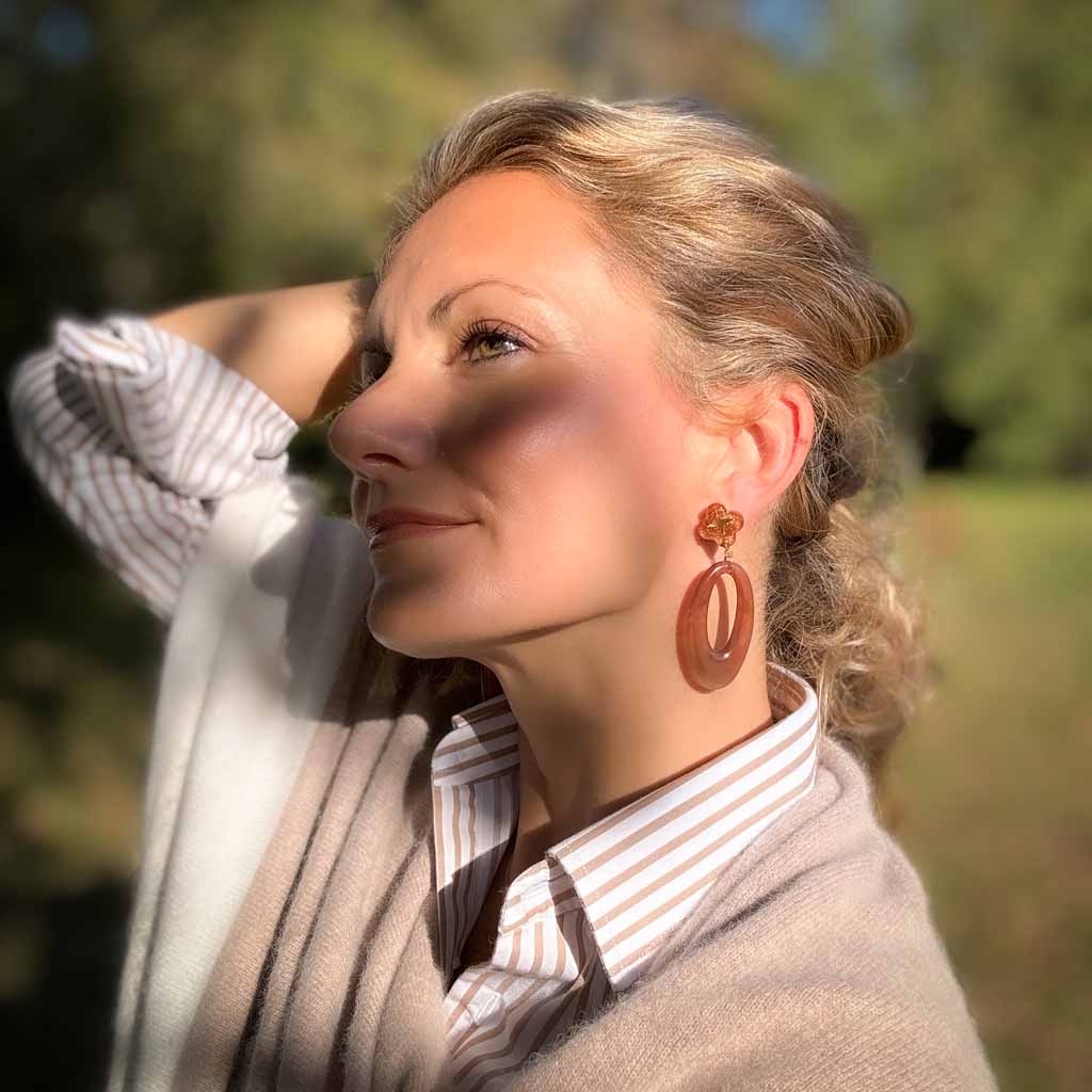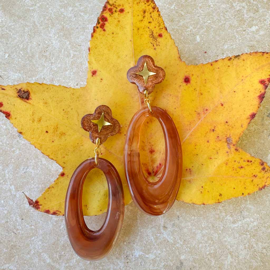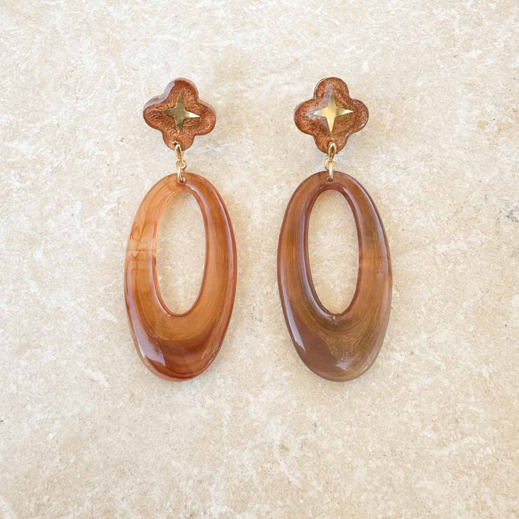 Gli orecchini Caramello sono un paio di orecchini a perno con croce quadrilobata. Realizzati in resina e mica color caramello scintillante, contengono una croce in ottone inglobata all'interno. Due grandi anelli in resina color caramello con effetti trasparenti completano il paio. Gli orecchini non possono essere dotati di clip. Gli orecchini a perno sono realizzati in acciaio inossidabile antiallergico e sono dotati di una chiusura a farfalla e di uno stop in silicone. Si consiglia di indossarli con entrambi insieme.