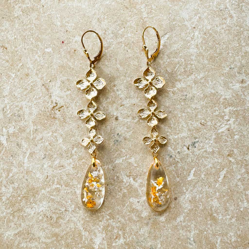 Gioiello fatto a mano, gocce di resina, foglia d'oro e d'argento, lunghe nappe di tre fiori, montatura a monachella gold filled. Lunghezza totale dell'orecchino forato 8 cm / montaggio a clip 7,5 cm. Per preservare la brillantezza dei gioielli, si consiglia di tenerli lontani da acqua e profumi e di riporli in una scatola quando non vengono utilizzati.