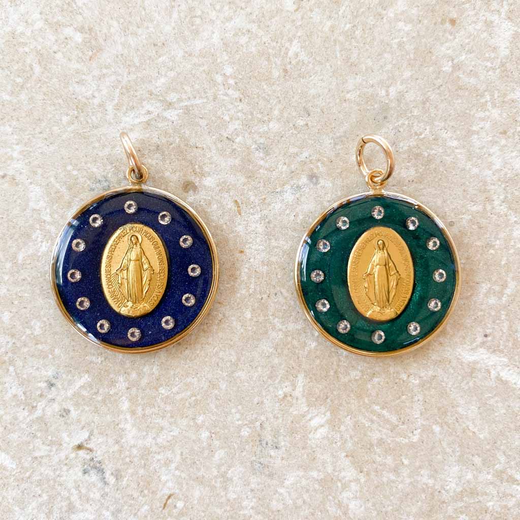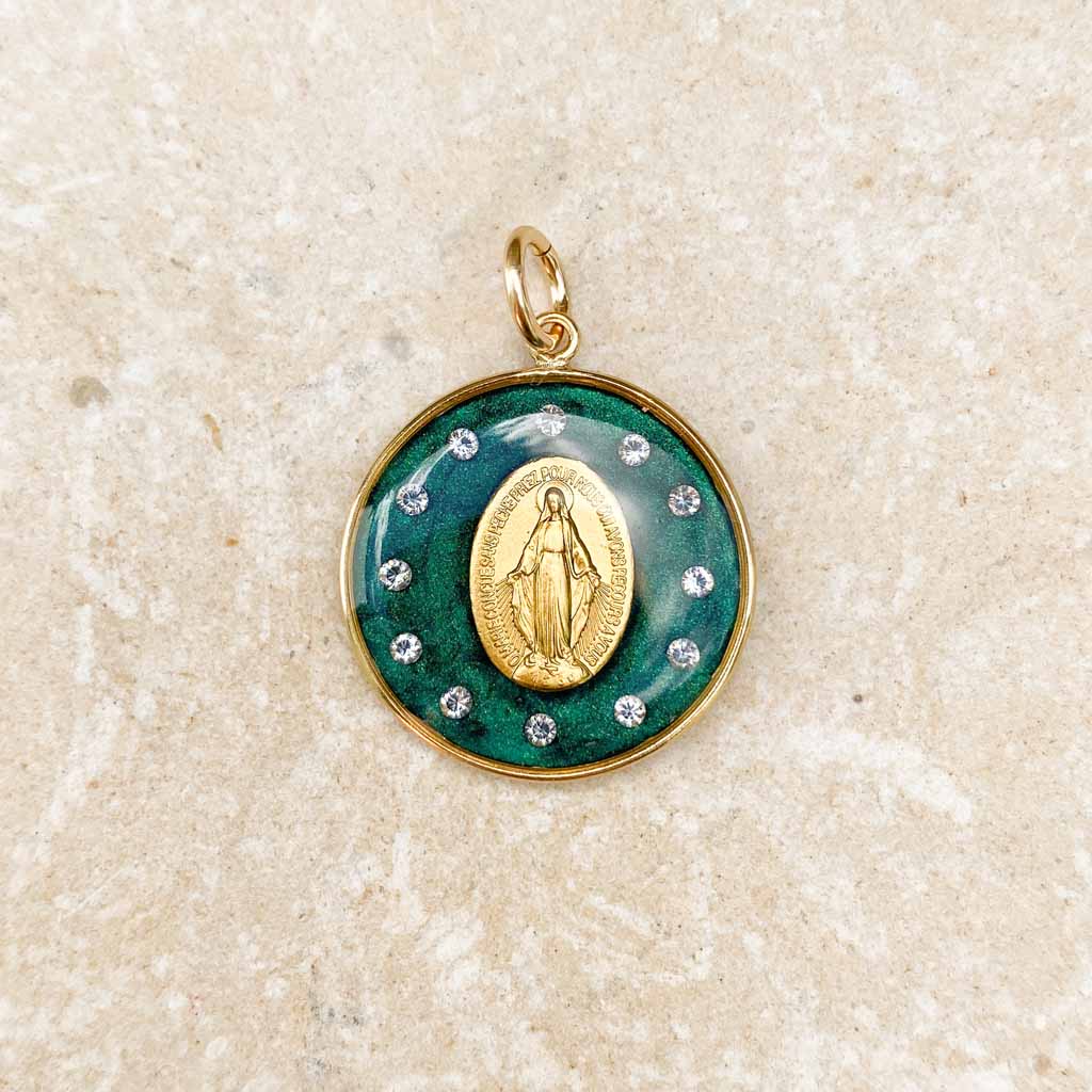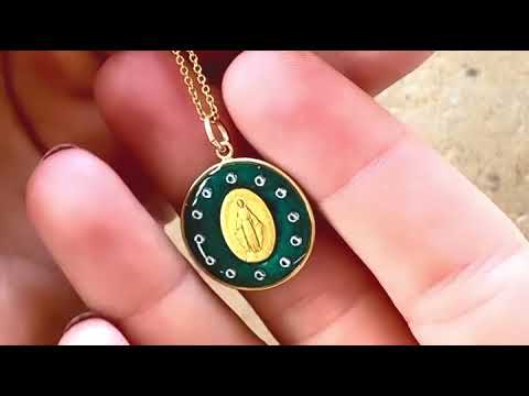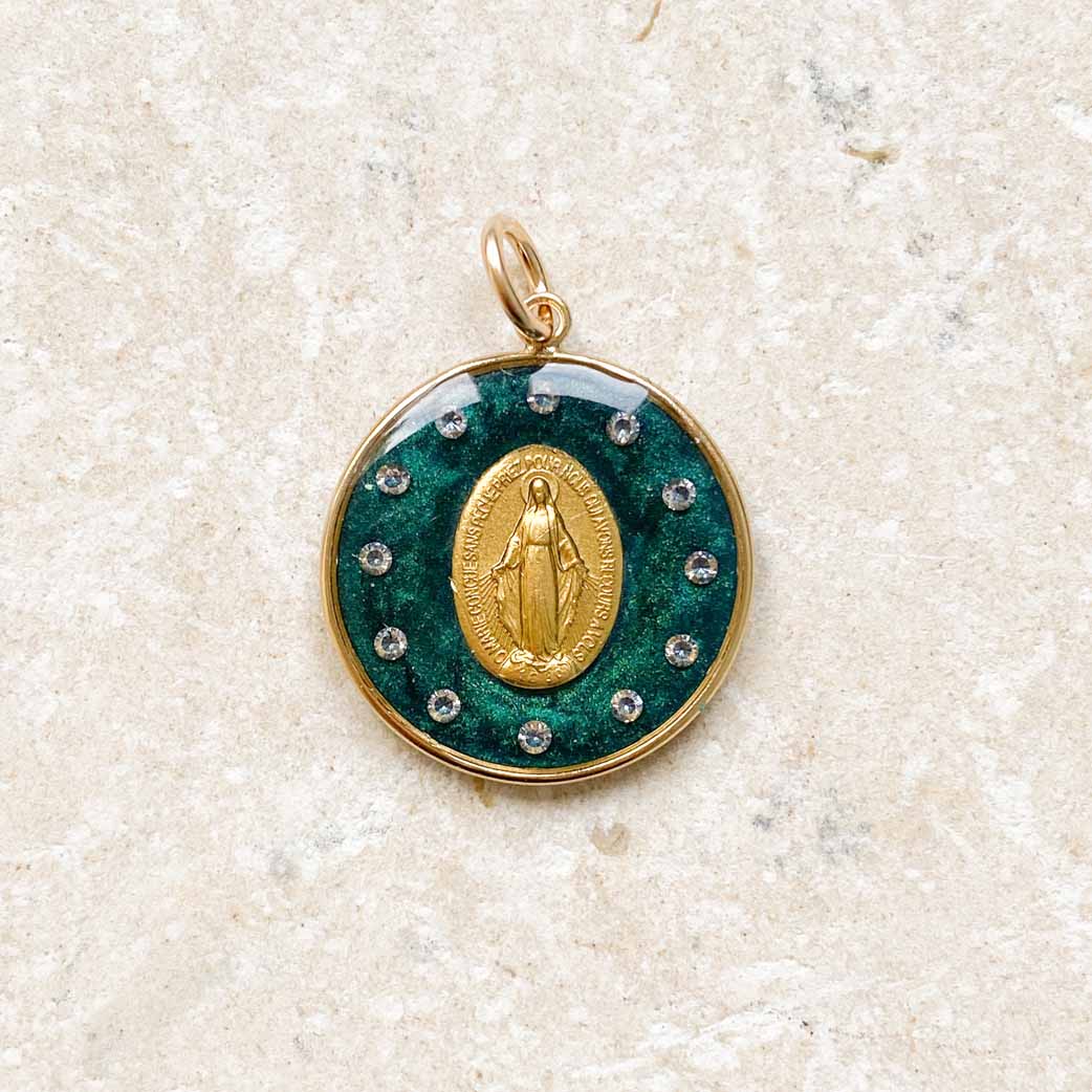 La medaglia miracolosa con corona di stelle blu è un vero e proprio bestseller. Ho deciso di realizzarla in una magnifica mica verde smeraldo. È sempre un'impresa un po' tecnica: lavorare con diamanti molto fini e permettere che il retro della medaglia rimanga visibile. È un gioiello lungo e complesso da realizzare (il che spiega il suo prezzo leggermente più alto), ma sono entusiasta della sua luce e della sua maestosità mariana.