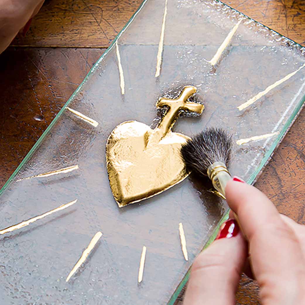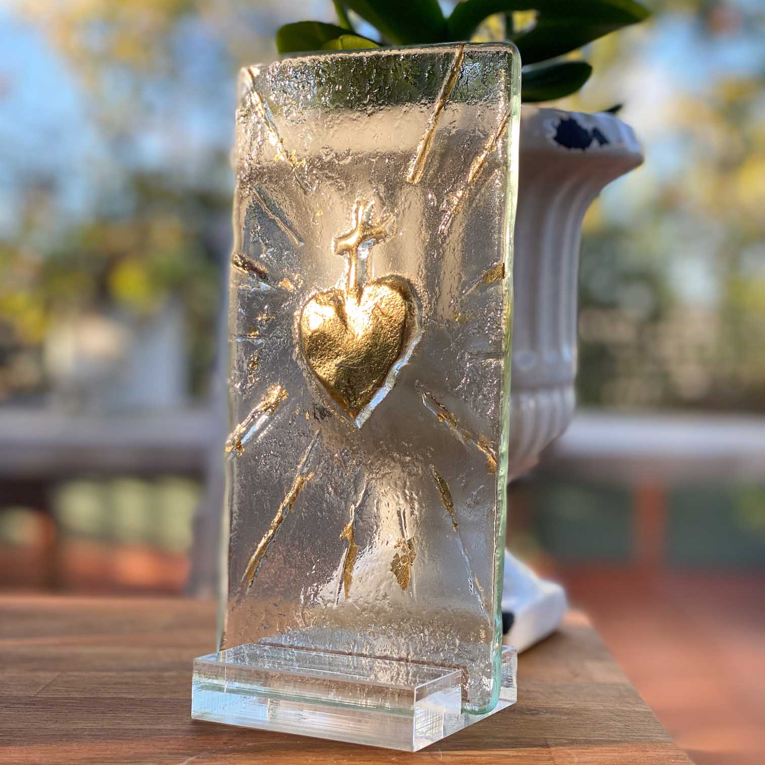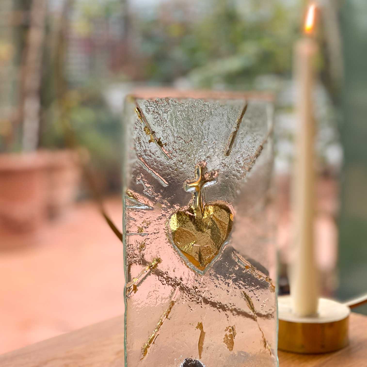 Questo modello è la versione in vetro e oro del sacro cuore rosso. È un pezzo scolpito a mano e termoformato in vetro a oltre 800 gradi.Prima della cottura, ho aggiunto del vetro colorato in polvere, che si è mescolato al vetro neutro durante la cottura.