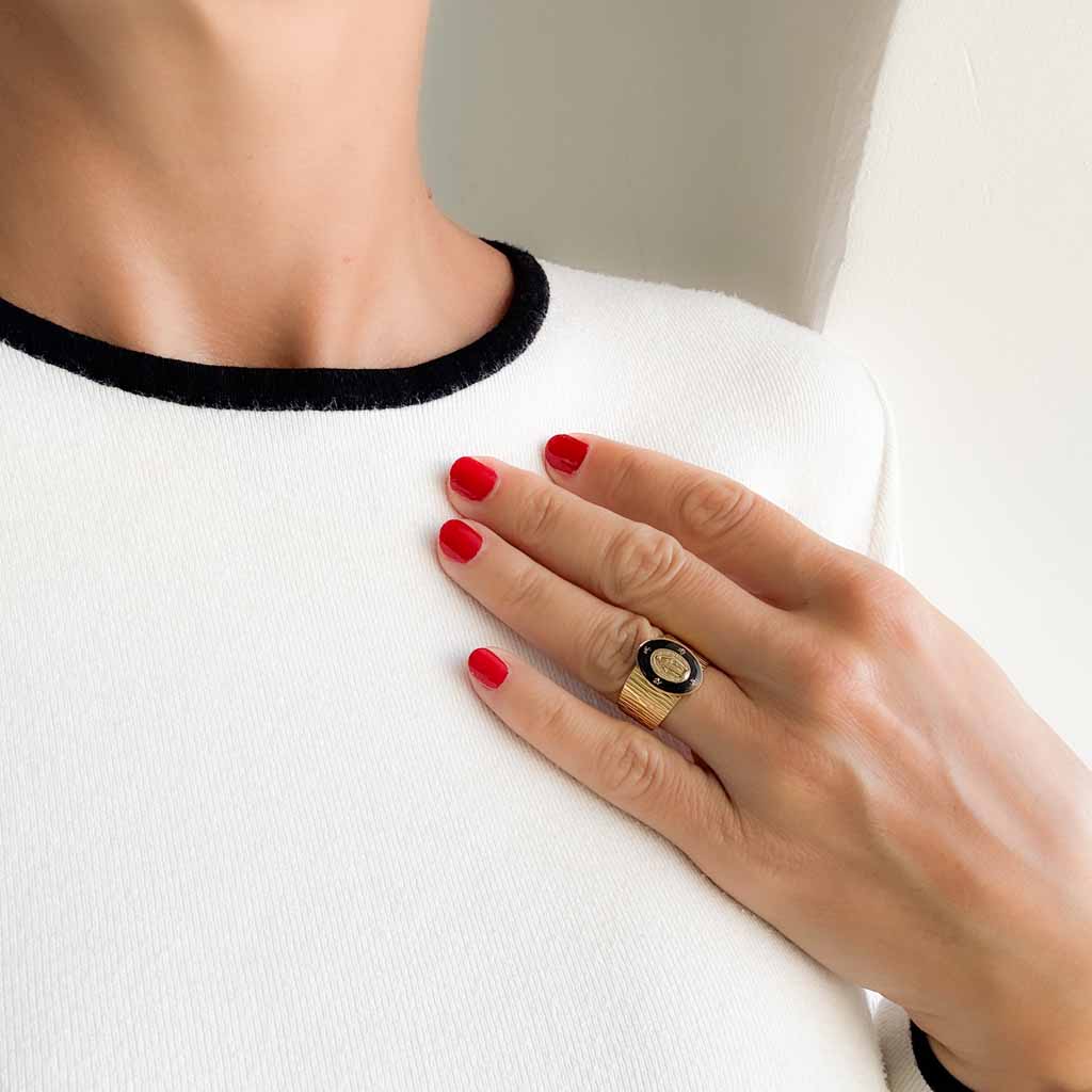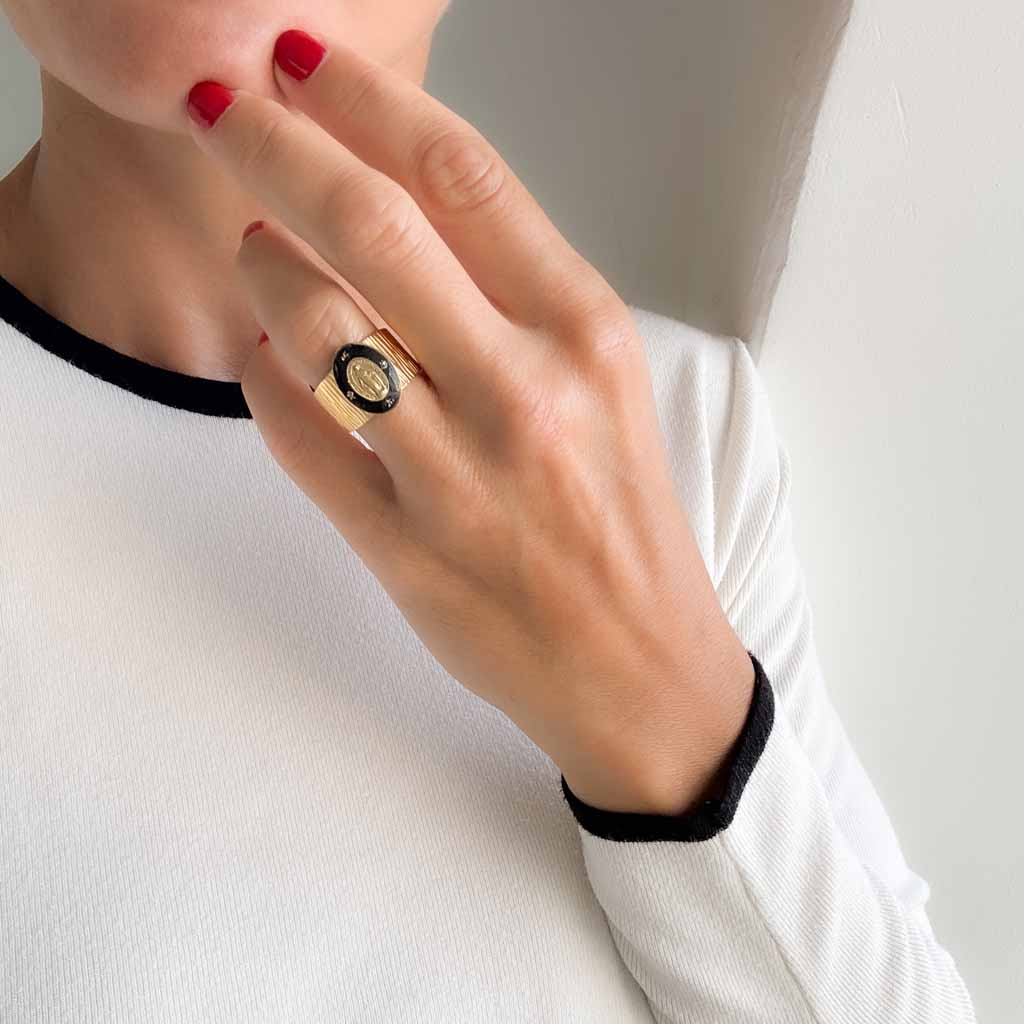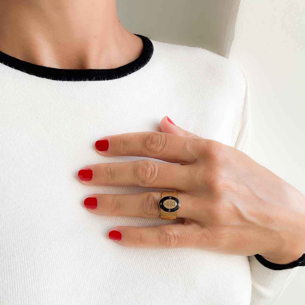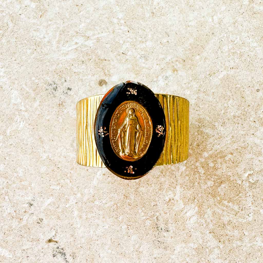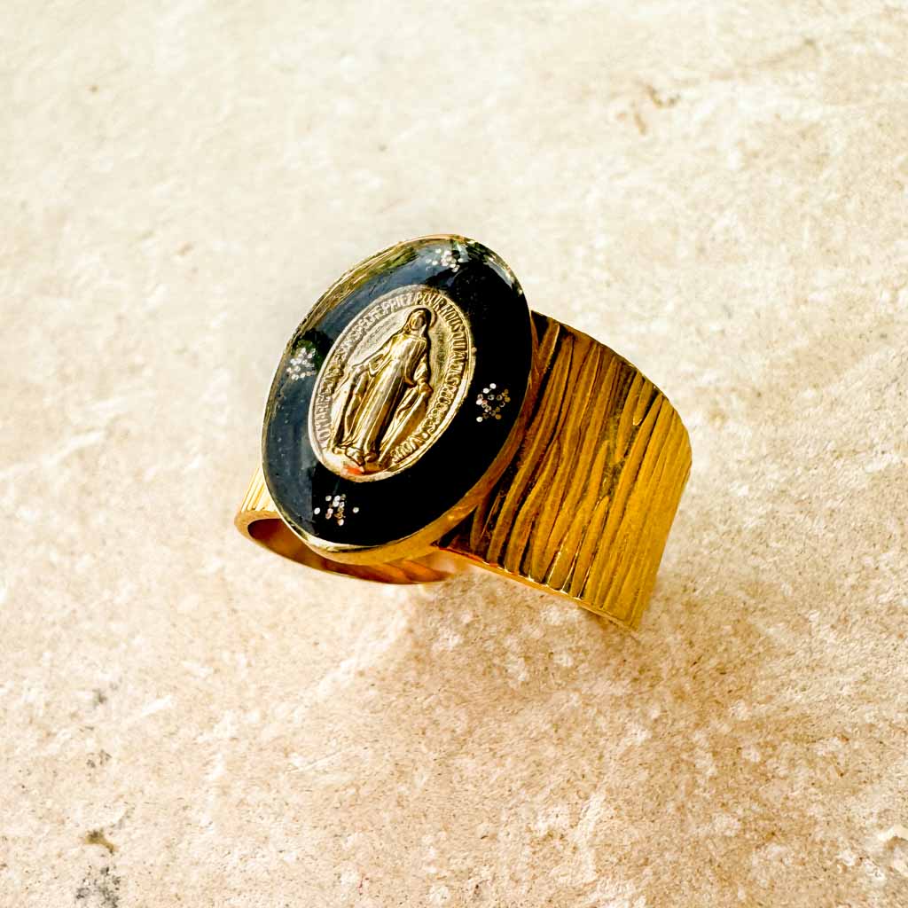 Spesso indosso il nero. Amo questo colore elegante, che l'oro può illuminare. Così mi è venuto il desiderio di un anello molto femminile e "alla moda", ma senza perdere il significato e la profondità che spero di dare alle mie creazioni. In questo modello carinamente rigato a macchina, il cabochon è in resina laccata nera e contiene una medaglia della rue du Bac con quattro piccole costellazioni di paillettes dorate che formano una croce. Questo anello ha tutte le caratteristiche della femminilità: nero, oro, paillettes... ma parla di cielo, e con esso Marie sarà al vostro fianco ogni giorno.