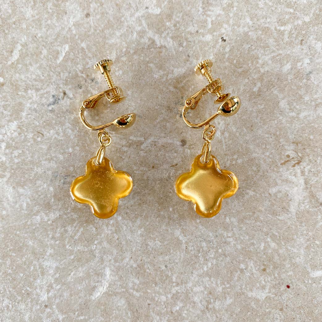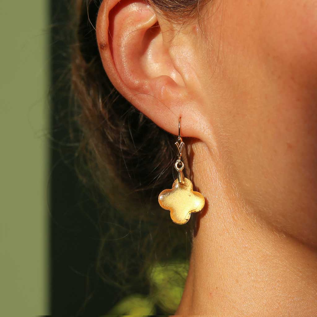 La chiusura a monachella è ben chiusa, quindi non c'è il rischio che il gioiello si impigli in una sciarpa. Coppia di orecchini chiusi a monachella, con motivo a giglio, placcati in oro. Ciondoli a croce quadrilobati di 1,5 cm di altezza e 1,5 cm di larghezza. La foglia d'oro depositata all'interno varierà sempre leggermente e avrà una sua poesia.