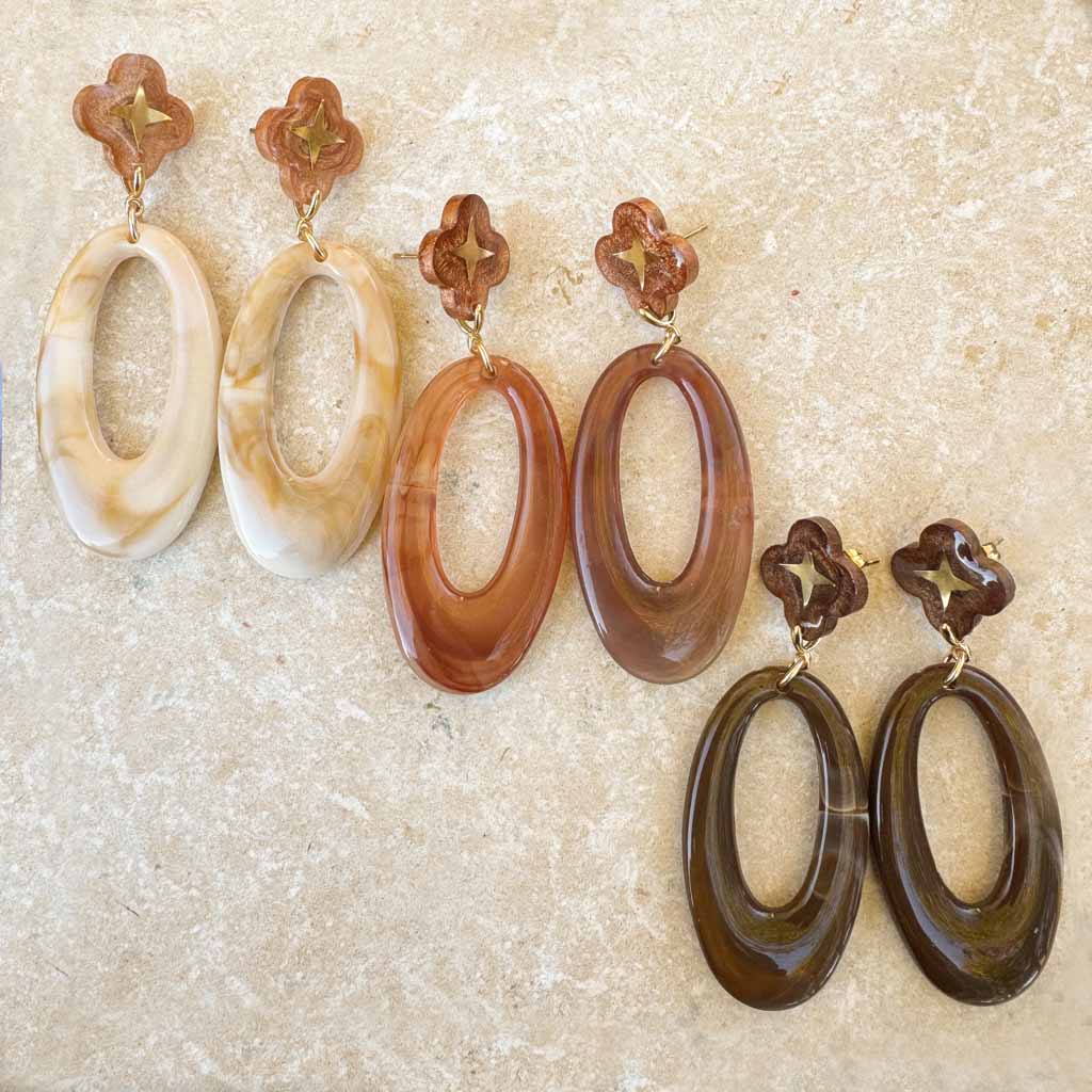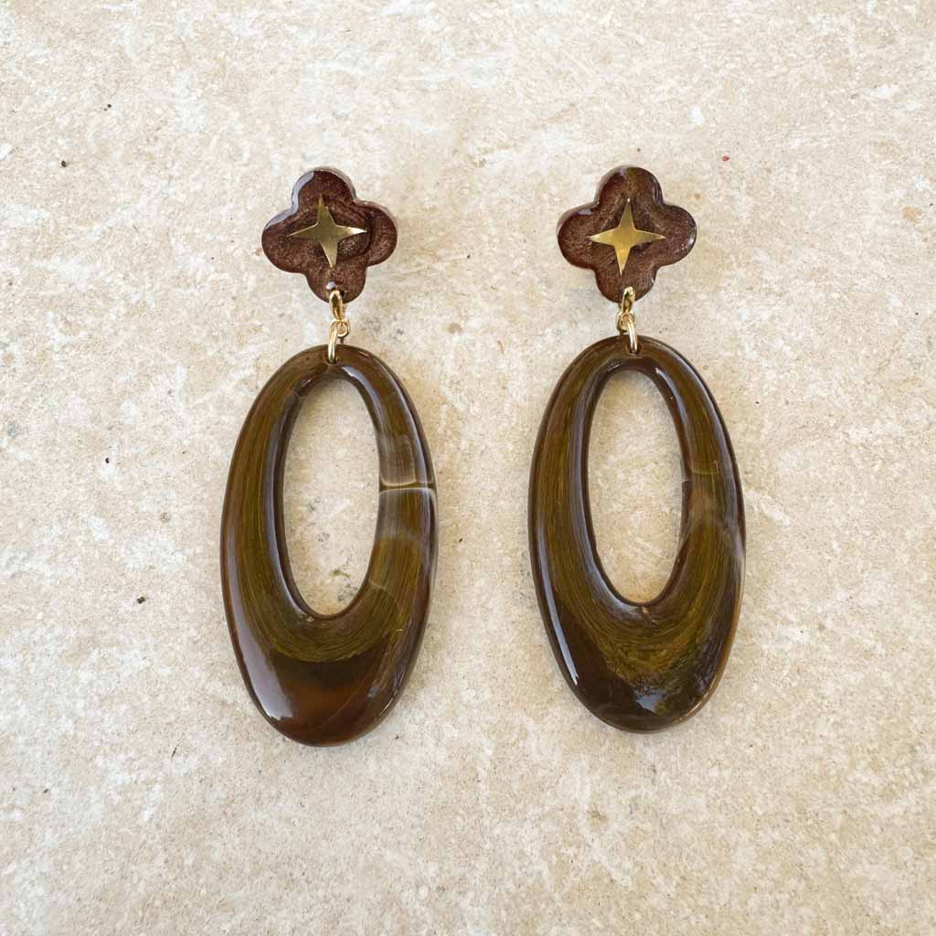 Gli orecchini Cioccolato sono costituiti da una coppia di orecchini a perno con croce quadrilobata. Realizzati in resina e mica color cioccolato leggermente luccicante, contengono una croce in ottone inglobata al suo interno. Completano la coppia due grandi cerchi in resina color cioccolato opaco con sottili effetti di marmorizzazione beige. Gli orecchini non possono essere dotati di clip. Gli orecchini a perno sono realizzati in acciaio inossidabile antiallergico e sono dotati di una chiusura a farfalla e di uno stop in silicone. Si consiglia di indossarli con entrambi insieme.