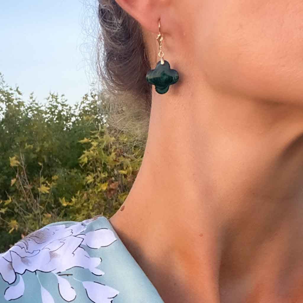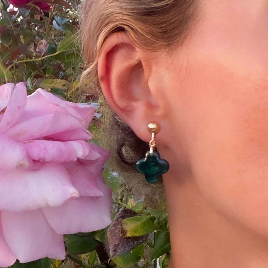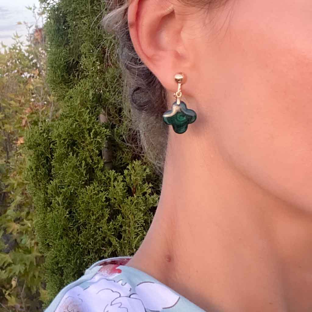 Sono lieta di proporre questo gioiello montato su metallo placcato oro. Questo modello è disponibile anchecome ciondolo a forma di croce, in modo da poter creare la propria parure. Croci quadrilobate alte 1,5 cm e larghe 1,5 cm. La mica verde intenso leggermente scintillante all'interno varia sempre un po' e ha una sua poesia. Montatura placcata oro, per orecchie forate o clip.