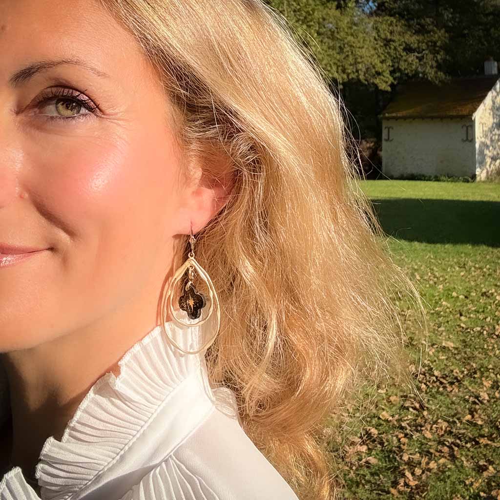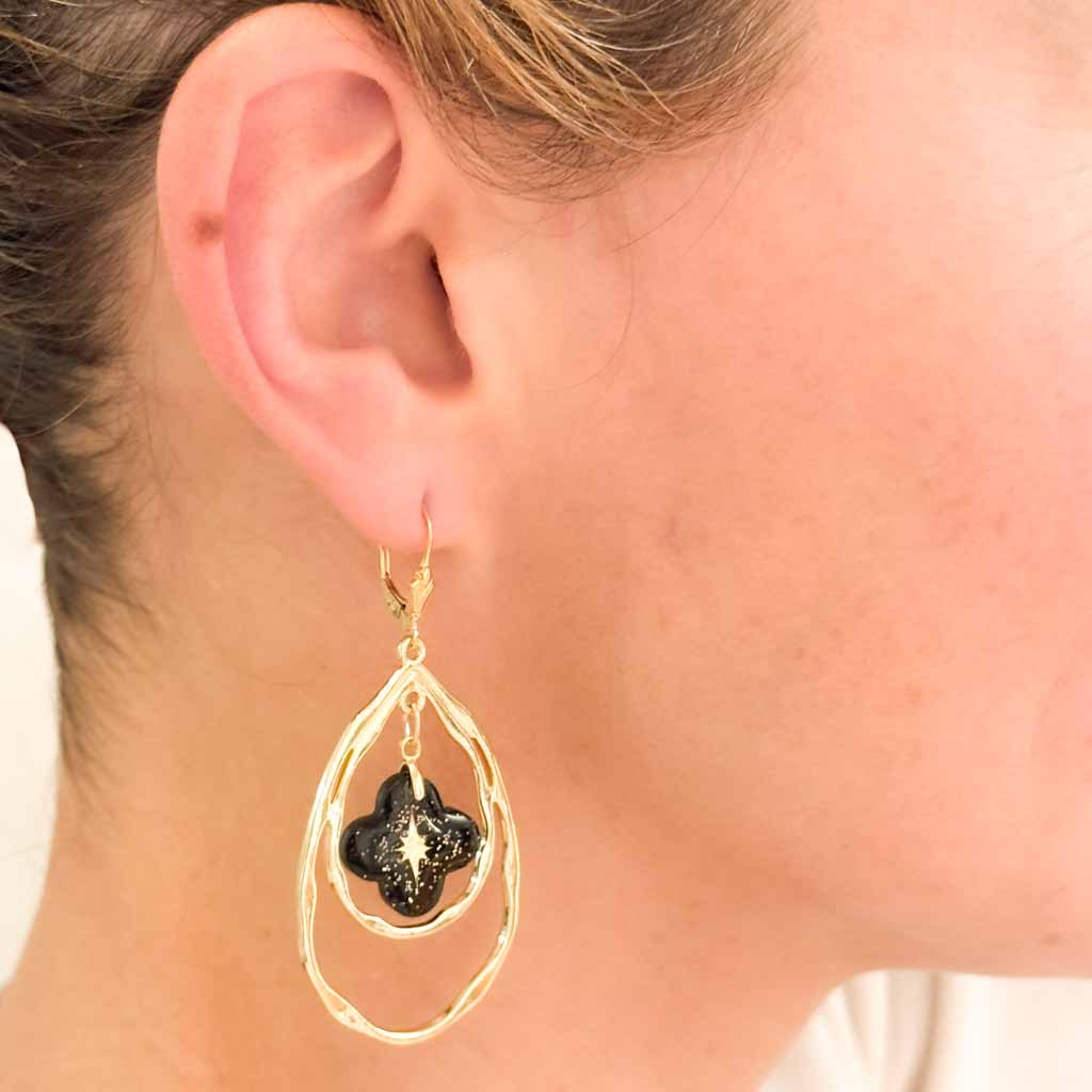 Orecchini grandi, in acciaio inossidabile antiallergico dorato. Chiusura a monachella in gold filled o clip. Croce quadrilobata in resina nera, ornata da una stella e da brillantini dorati.Altezza totale dell'orecchino 6,5 cm. Peso 3,5 g, orecchini molto leggeri che possono essere indossati senza alcun fastidio per tutto il giorno.