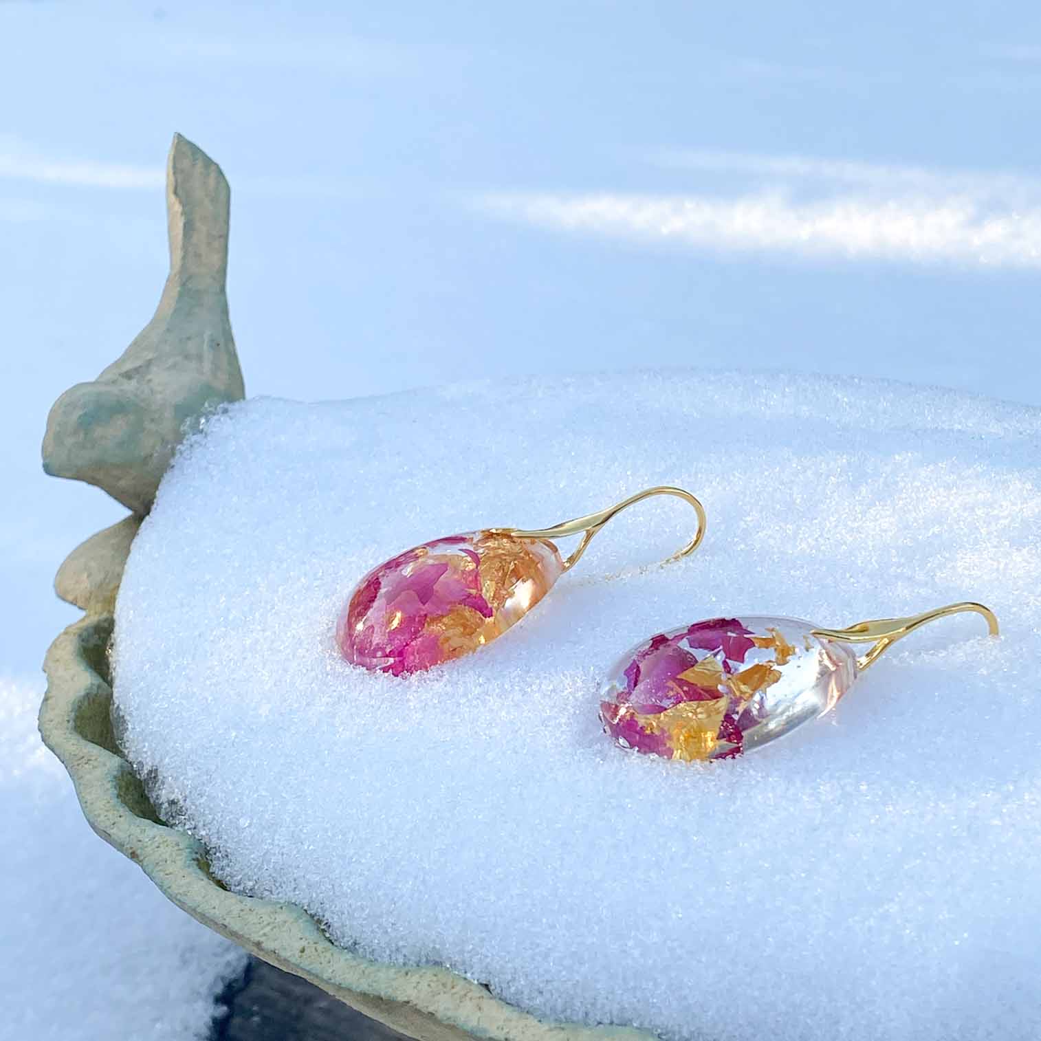 Ho scelto i petali di rosa e li ho preparati uno per uno. Li ho immersi in una resina cristallina che li lascia fluttuare liberamente e poi ho aggiunto la foglia d'oro 24 carati. Ho scolpito nella resina, che era ancora liquida.