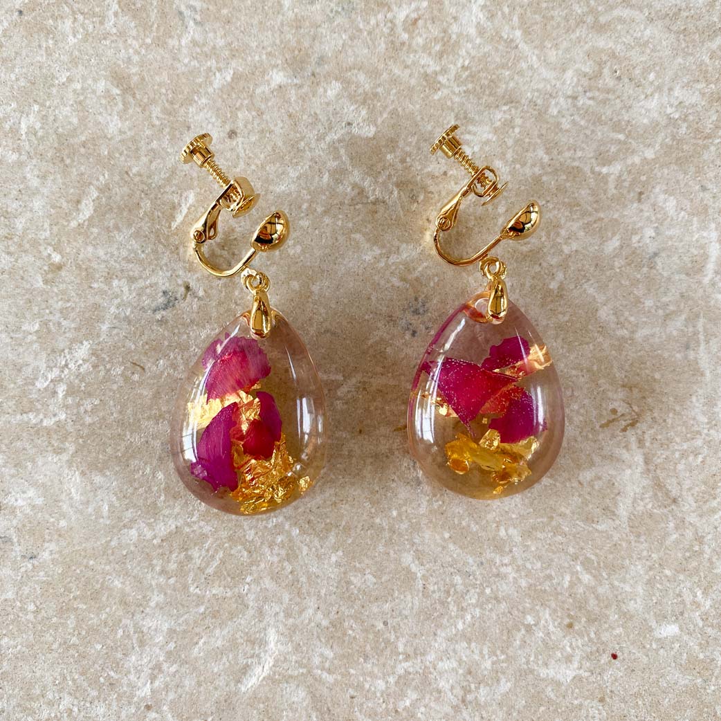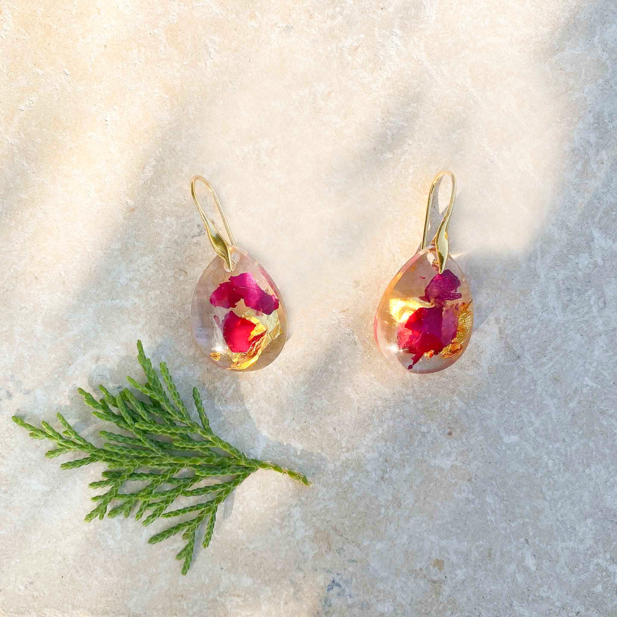 Teresina di Lisieux è i petali di rosa che semina per noi dal cielo. Ma è anche un'anima luminosa che attraversa le nostre notti e ci sostiene. Una luce che non si spegne mai. Qui i petali di rosa sono abbinati a foglie d'oro. Catturano la luce, anche nelle giornate più uggiose. Irradieranno un bagliore speciale nelle vostre orecchie.