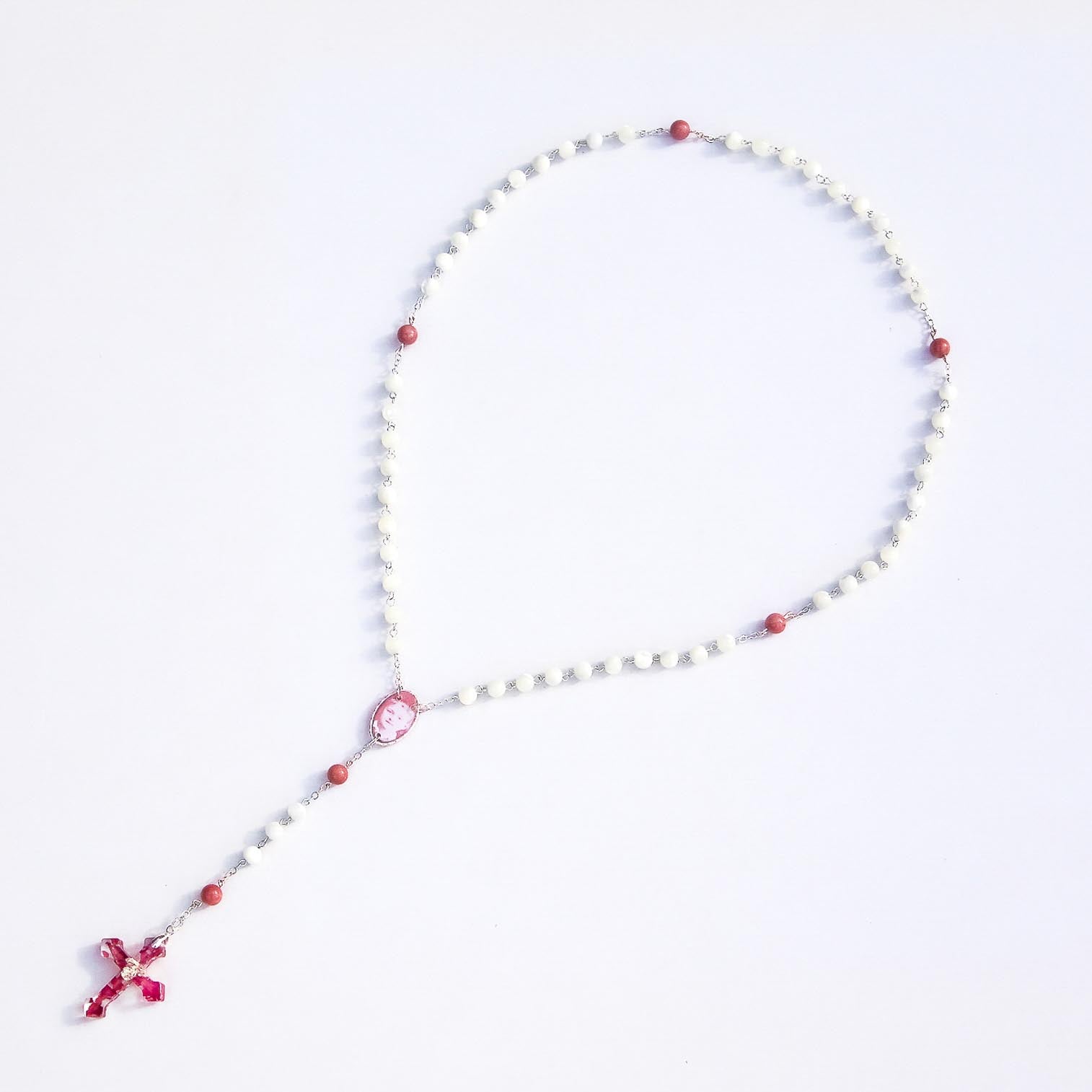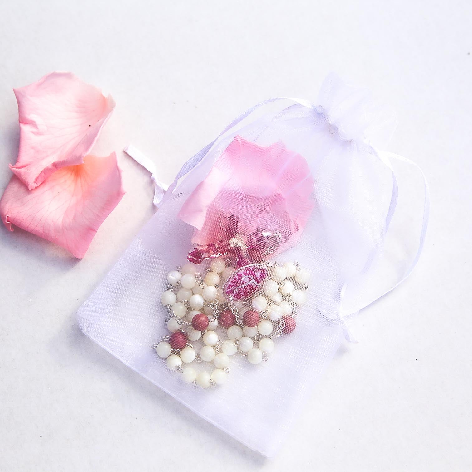 Rosario in madreperla e rodonite da 6 mm, creazioni di petali di rosa, resina e oro bianco. Lunghezza del rosario 45 cm. Inviato in una confezione regalo (non è necessario aggiungerne una, è inclusa), con una bustina di organza e un libretto esplicativo con le parole di santa Teresina sulla preghiera del rosario.