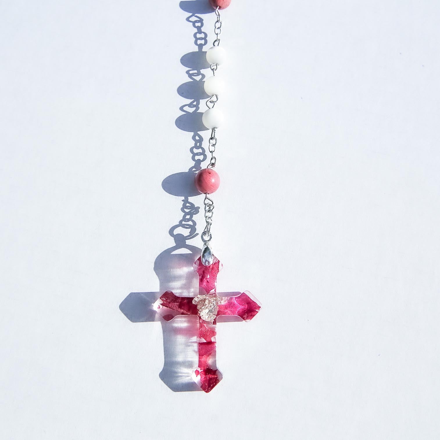 Ho voluto progettare questo rosario per intero: ho creato la sua croce, di petali di rosa con un cuore in foglia d'oro bianco. Ho anche creato a mano la medaglietta al centro del rosario: vi è raffigurato il dolce viso di santa Teresina da bambina, circondato da petali di rosa. Questo modello di rosario è assolutamente unico.