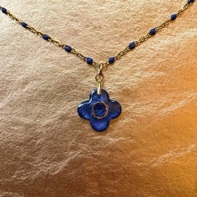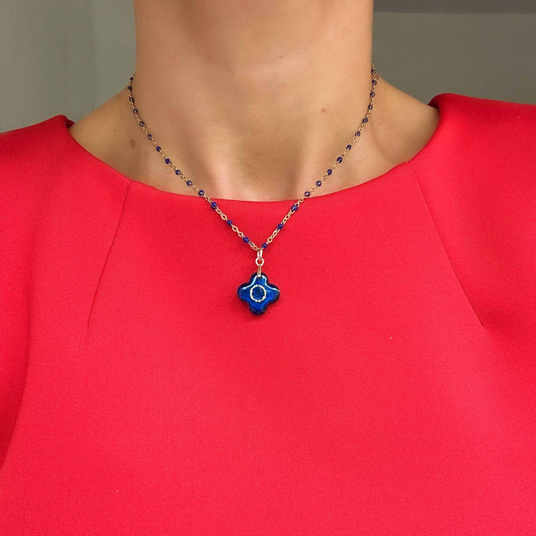 Gioiello realizzato a mano, croce quadrilobata in mica lapislazzuli finemente scintillante, corona dorata e montatura placcata oro a 3 micron, qui indossata con la catenina corta blu santa Sabina. Creato per Notre Dame de Paris.