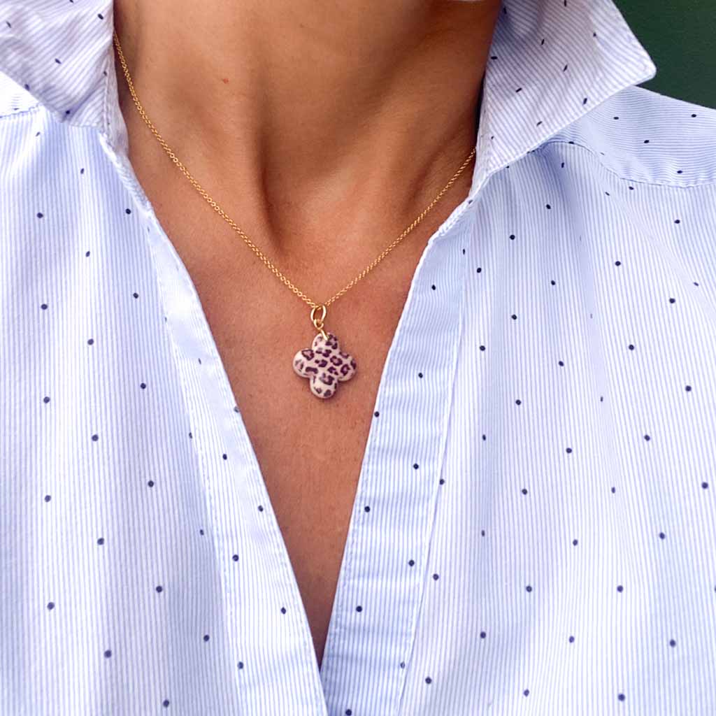 La croce può essere indossata come ciondolo, bracciale in metallo o bracciale in tessuto. È disponibile anche in orecchini. Se desiderate creare un set graou, potete usufruire di uno sconto del 15% con il codice PARURE da aggiungere al carrello.