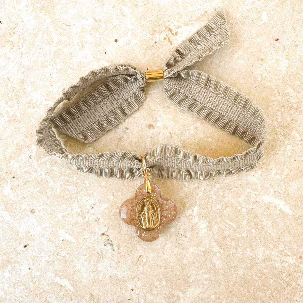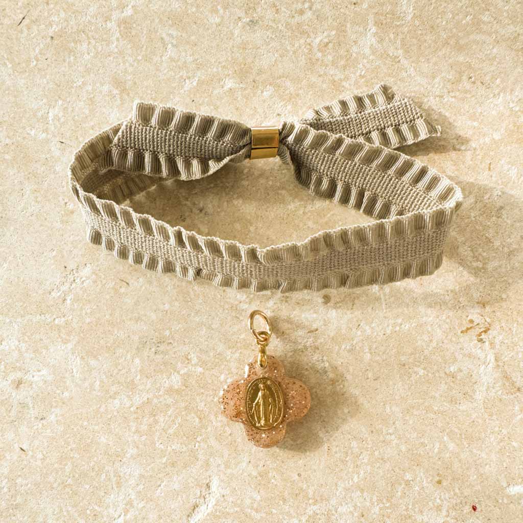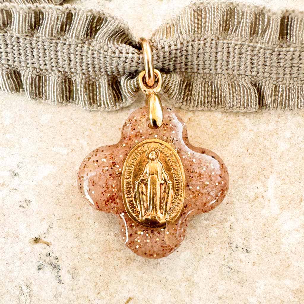 Ci sono gioielli per i quali non si riesce a spiegare il proprio attaccamento. È il caso di questa piccola croce scintillante. È piccolina, quindi posso indossarla come girocollo, come collana lunga o al polso con il braccialetto libertà. Ecco la croce. Maria è al centro con la medaglia miracolosa della Rue du Bac. L'ho realizzata con una sabbia rosa tenue che mi ricorda le dune del deserto e i pellegrinaggi silenziosi che tanto mi hanno insegnato sullo splendore del mondo. Ho aggiunto poi dei brillantini. Paillettes dorate che brillano di gioia. È tutta piccolina e per me ha tutto. È la mia compagna quotidiana.