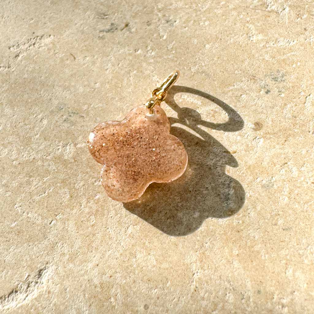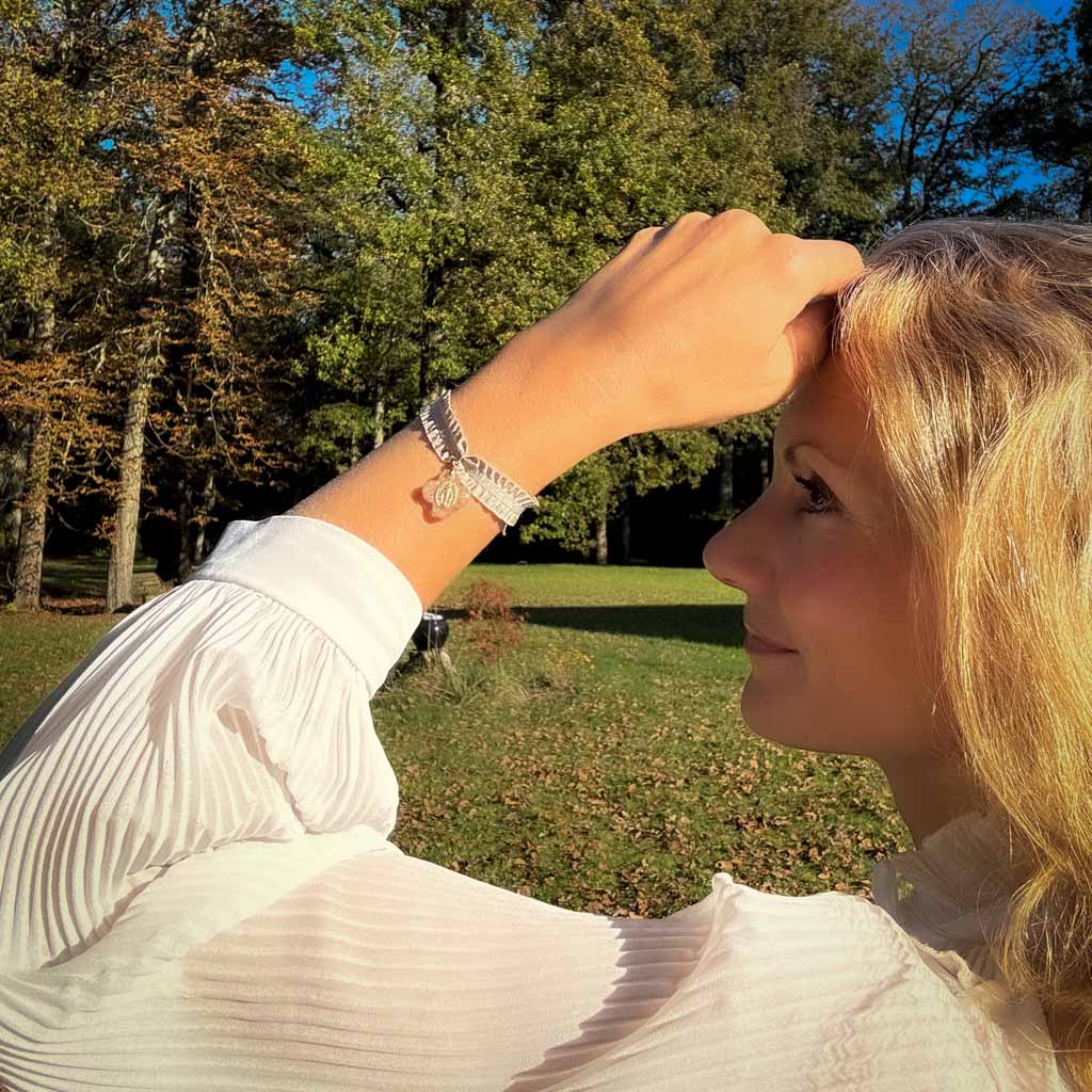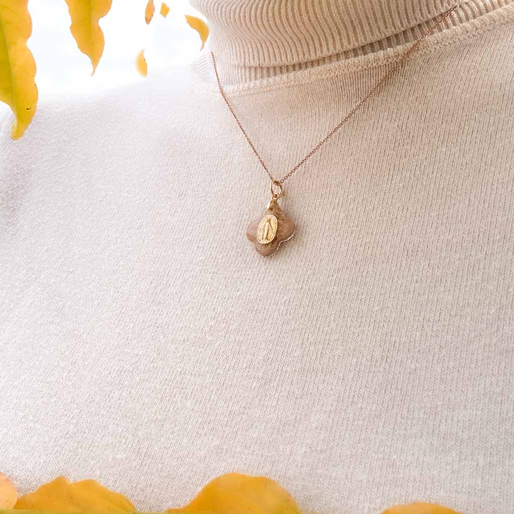 Ci sono gioielli per i quali non si riesce a spiegare il proprio attaccamento. È il caso di questa piccola croce scintillante. È piccolina, quindi posso indossarla come girocollo, come collana lunga o al polso con il braccialetto libertà. Ecco la croce. Maria è al centro con la medaglia miracolosa della Rue du Bac. L'ho realizzata con una sabbia rosa tenue che mi ricorda le dune del deserto e i pellegrinaggi silenziosi che tanto mi hanno insegnato sullo splendore del mondo. Ho aggiunto poi dei brillantini. Paillettes dorate che brillano di gioia. È tutta piccolina e per me ha tutto. È la mia compagna quotidiana.