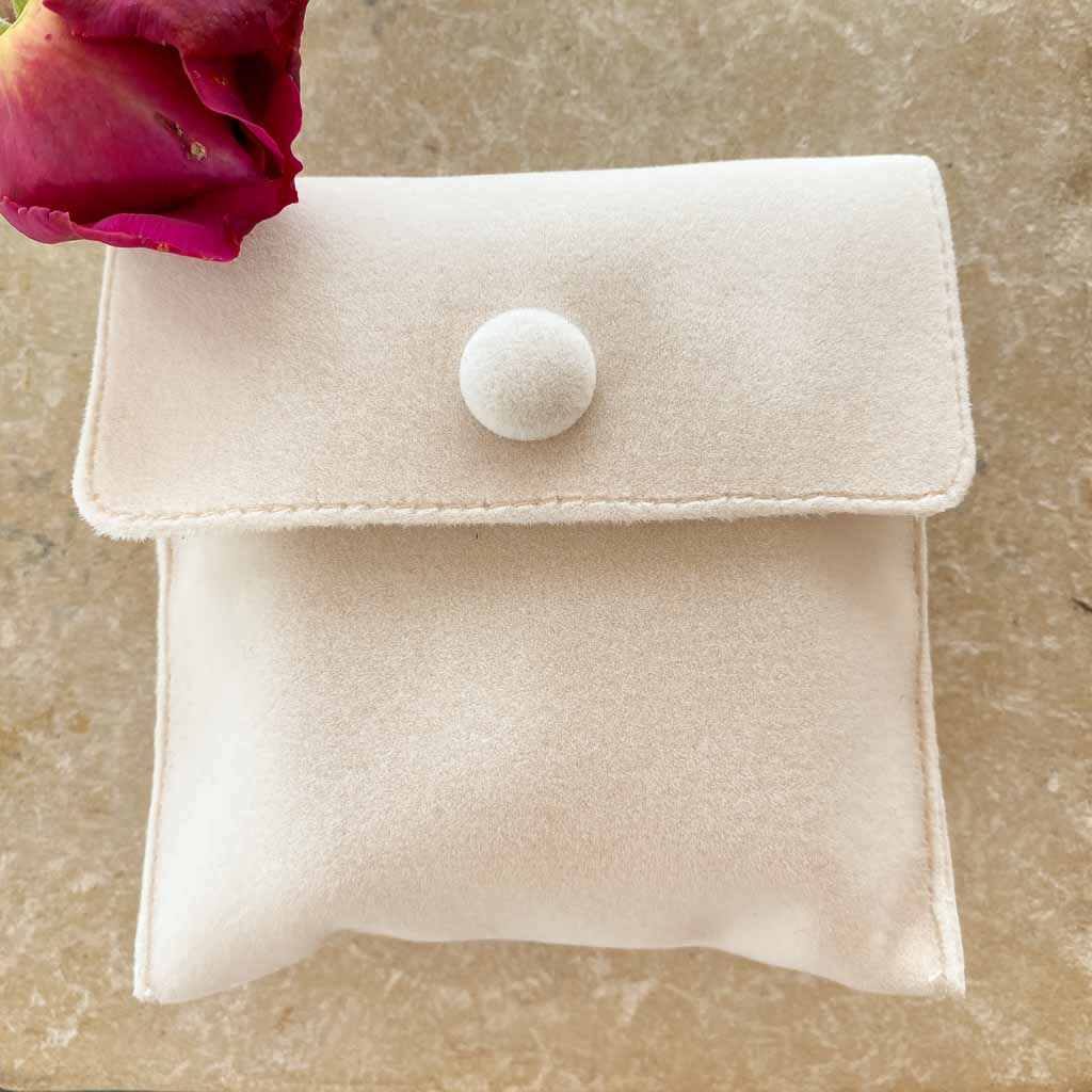 Per questo gioiello della collezione Gioielleria, il portagioie Fleur Nabert créations è automaticamente incluso, così come una graziosa custodia in pelle scamosciata color avorio. Molto morbida, permetterà di conservare il proprio gioiello quando non lo si indossa. Contiene anche un grazioso biglietto di invito alla preghiera che si può conservare all'interno dell'astuccio per portarlo sempre con sé nella propria borsetta.