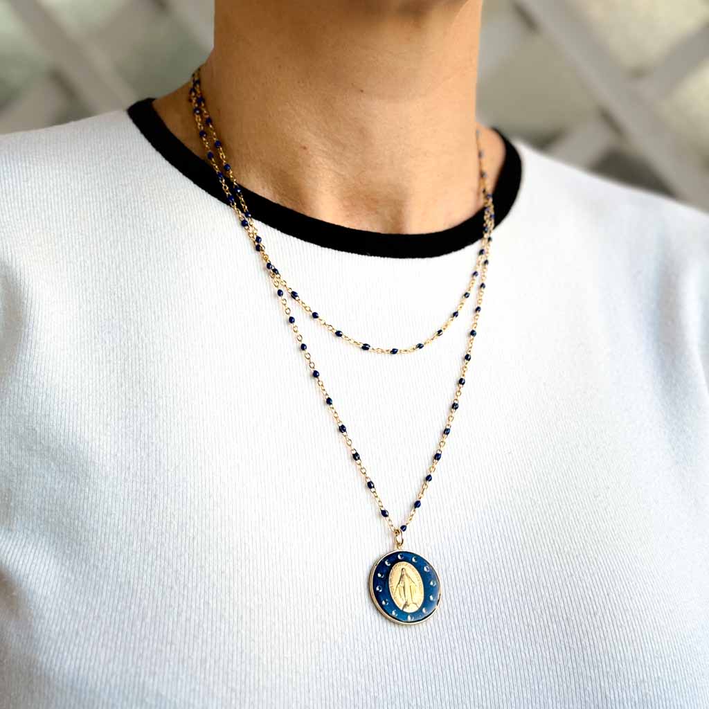 Mi piace l'immagine della Vergine incoronata con dodici stelle. L'ho già realizzata come icona. Ma volevo realizzarla anche come gioiello. È stata un'impresa lavorare con brillanti molto fini e permettere che il retro della medaglia fosse sempre visibile. È un gioiello lungo e complesso da realizzare (il che spiega il suo prezzo un po' più alto), ma sono entusiasta della sua luce e della sua maestosità mariana.