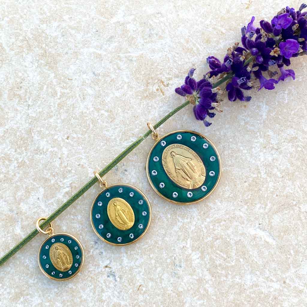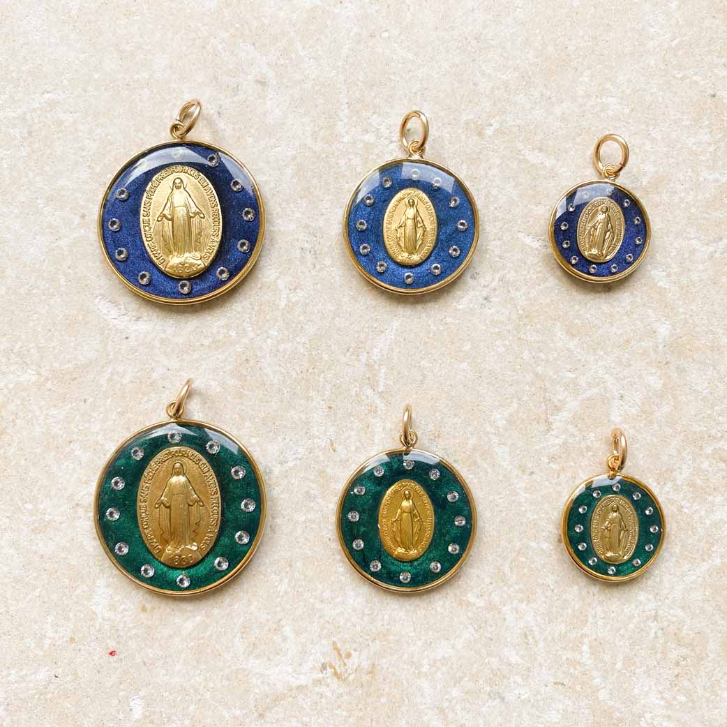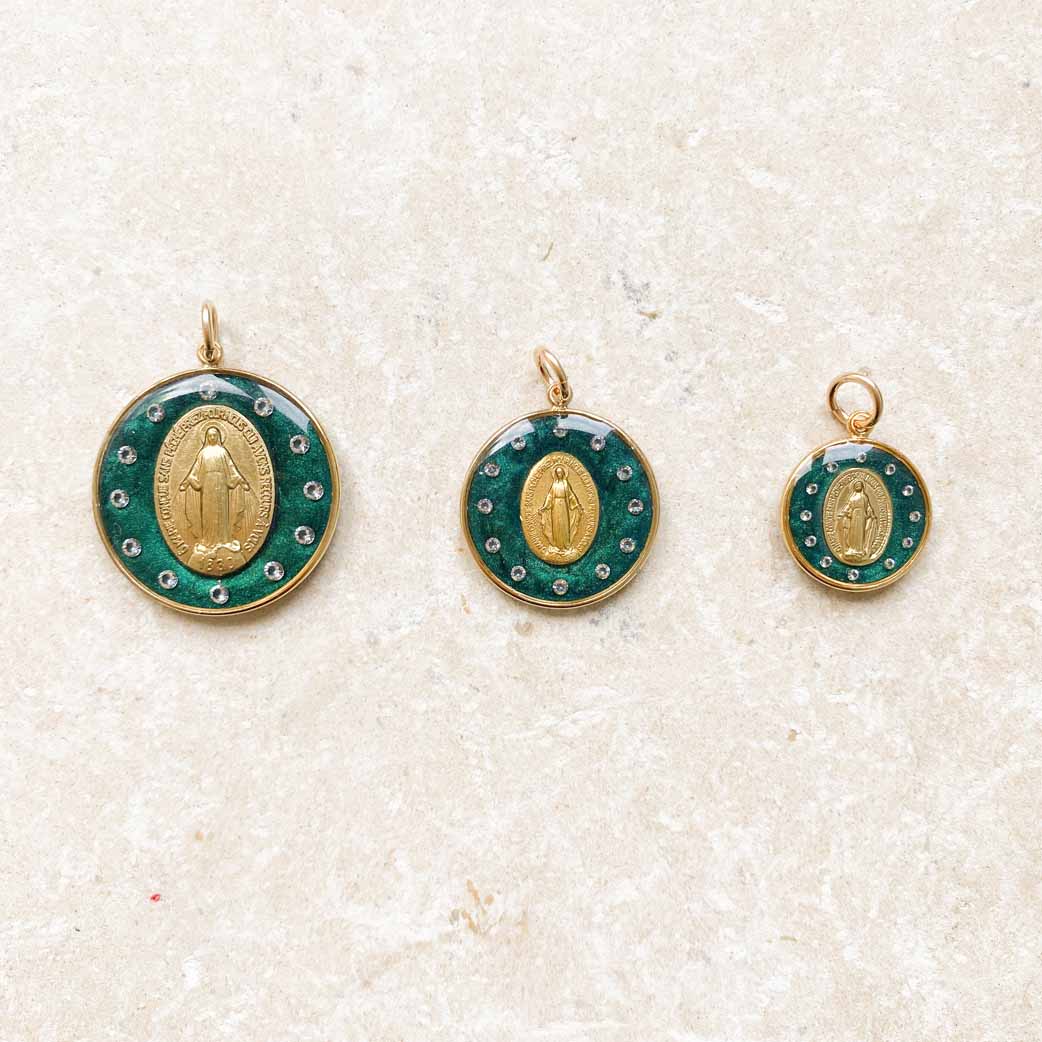 Mi piace l'immagine della Vergine incoronata con dodici stelle. L'ho già realizzata come icona. Ma volevo realizzarla anche come gioiello. È stata un'impresa lavorare con diamanti molto fini e permettere che il retro della medaglia fosse sempre visibile. È un gioiello lungo e complesso da realizzare (il che spiega il suo prezzo leggermente più alto), ma sono entusiasta della sua luce e della sua maestosità mariana. La famiglia delle stelle si allarga: dopo la versione blu, ecco quella verde!