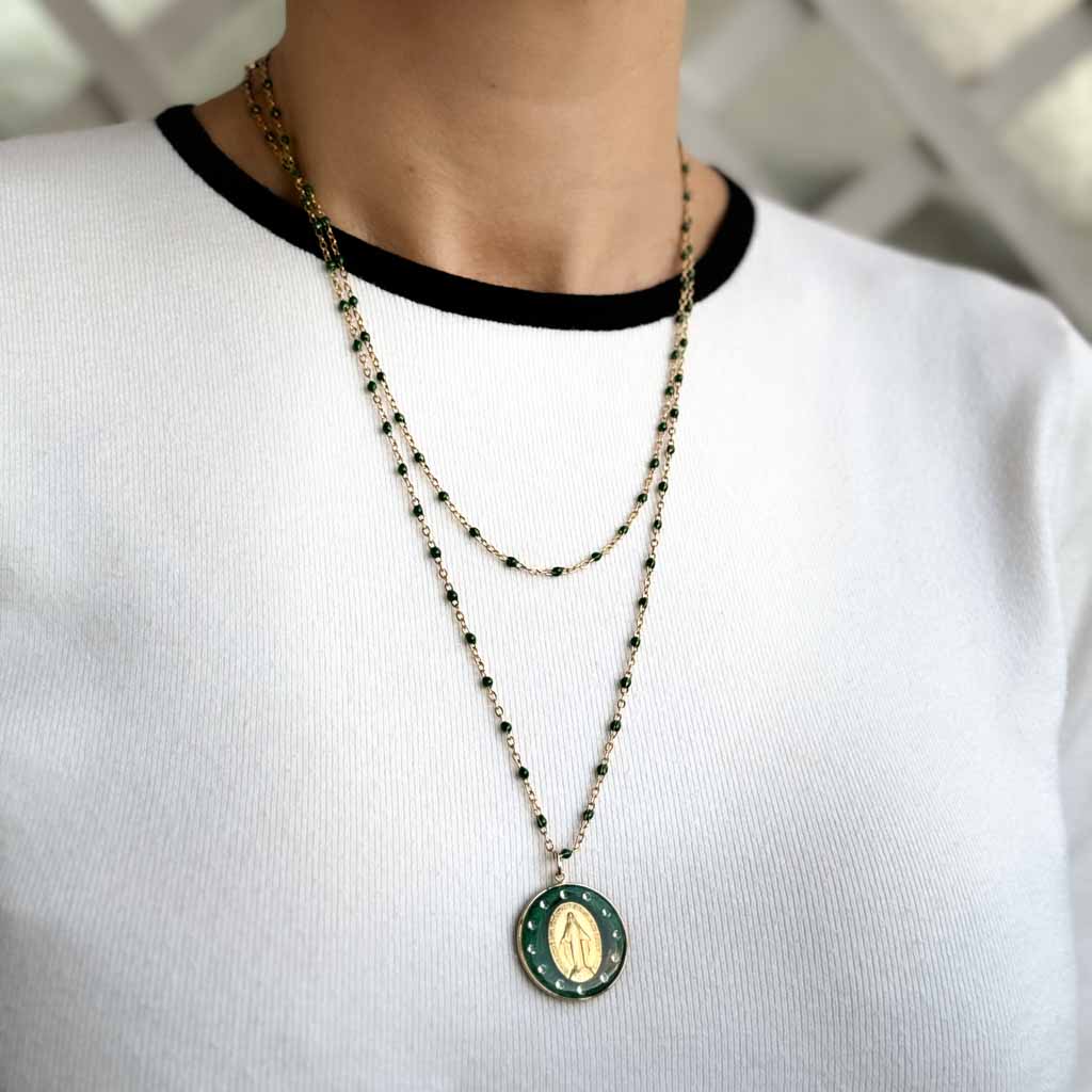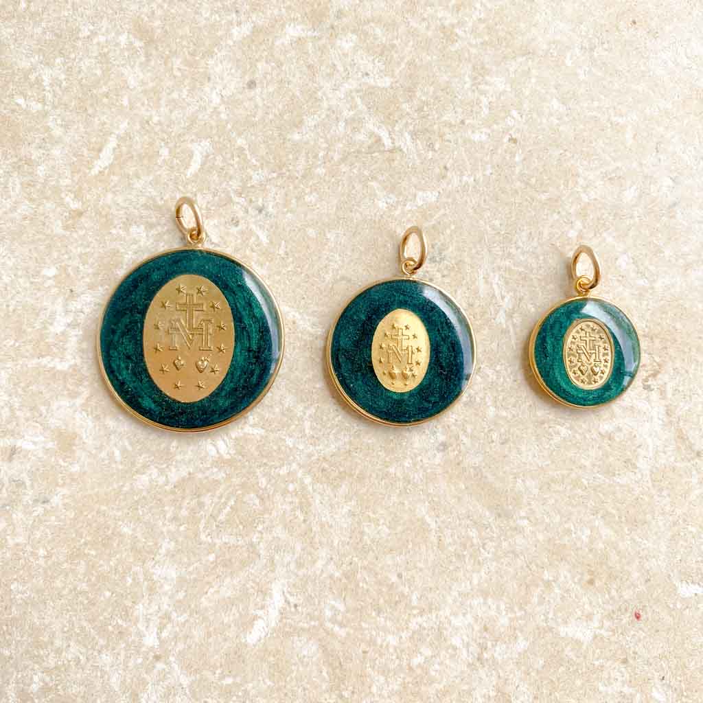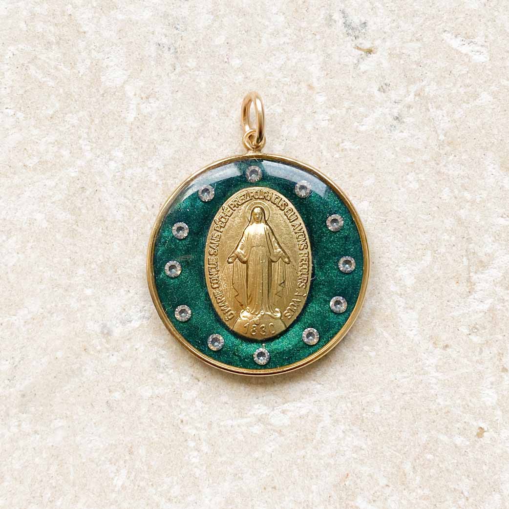 Mi piace l'immagine della Vergine incoronata con dodici stelle. L'ho già realizzata come icona. Ma volevo realizzarla anche come gioiello. È stata un'impresa lavorare con diamanti molto fini e permettere che il retro della medaglia fosse sempre visibile. È un gioiello lungo e complesso da realizzare (il che spiega il suo prezzo leggermente più alto), ma sono entusiasta della sua luce e della sua maestosità mariana. La famiglia delle stelle si allarga: dopo la versione blu, ecco quella verde!
