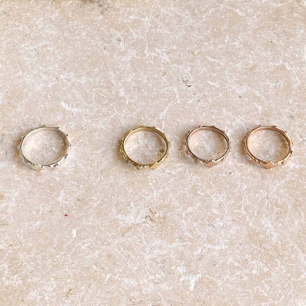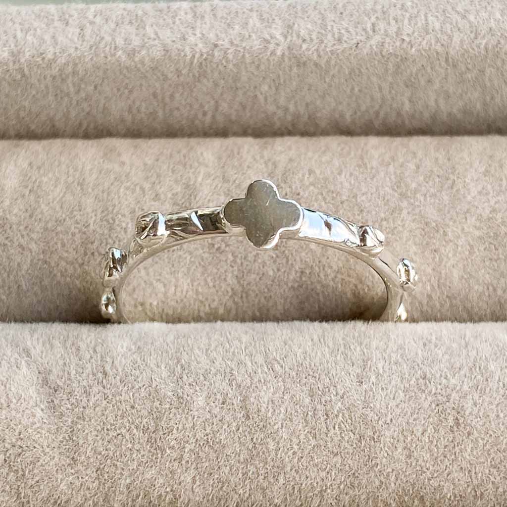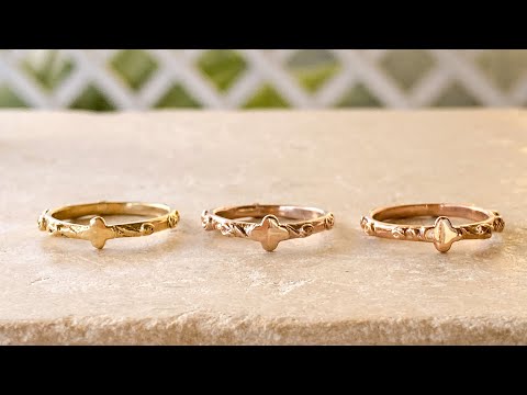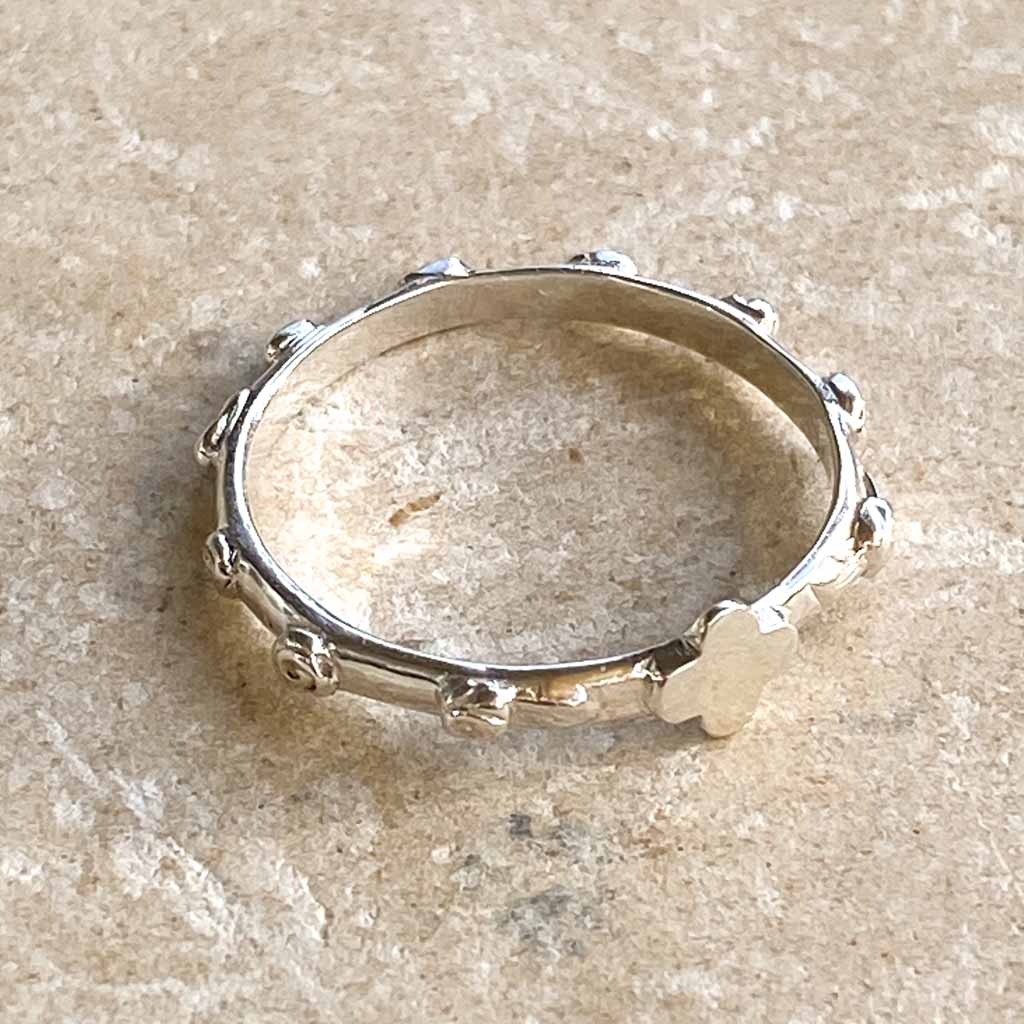 Adoro gli anelli decina, ma non ne ho mai trovato uno bello o femminile. Questo è caratterizzato da una croce quadrilobata e da dieci boccioli di rosa scolpiti a mano. Questa edizione è in argento massiccio, in modo da poter beneficiare del lavoro di creazione e scultura, ma con un metallo meno costoso. È disponibile anche in oro rosa, oro champagne e oro giallo. Tutti i lavori di modellazione, cera e cesellatura sono realizzati nel mio laboratorio, l'oro è francese e viene fuso a Lione. Porta il mio marchio.