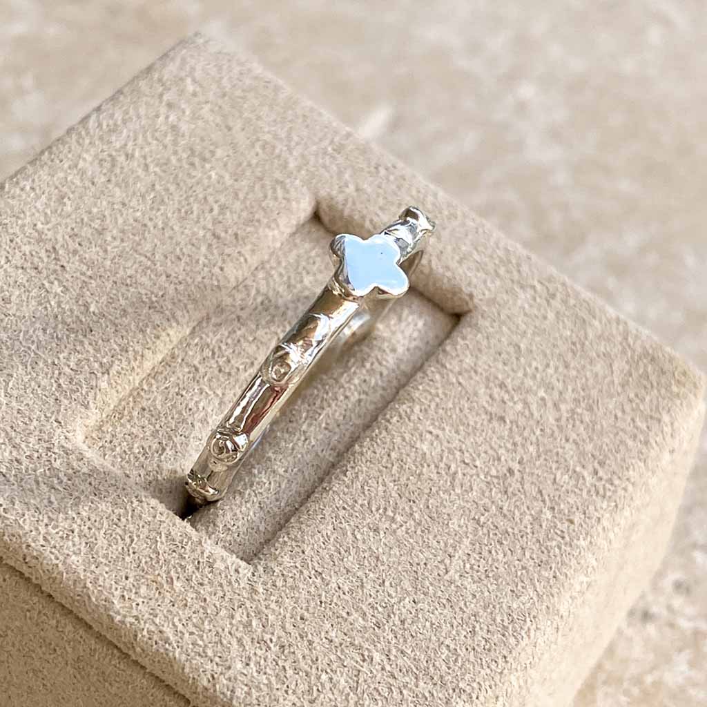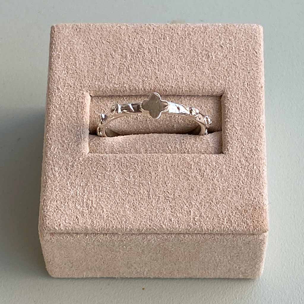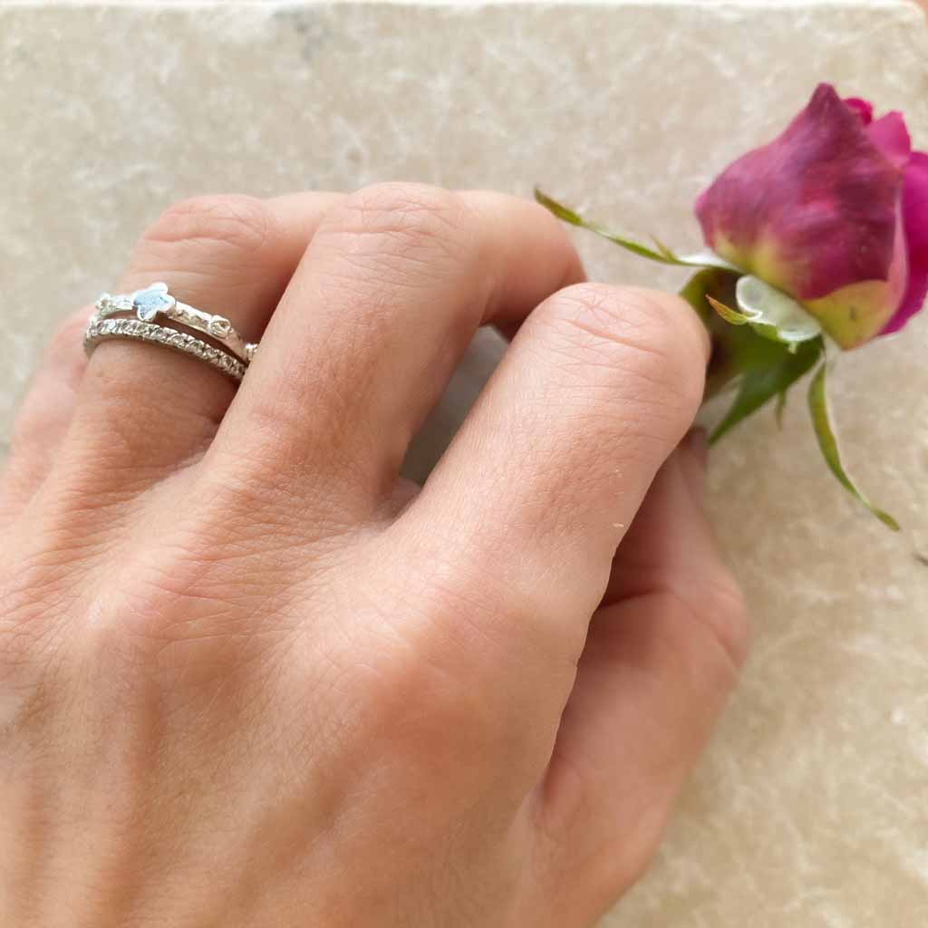 È un anello per tutta la vita, da portare accanto alla fede nuziale, ad esempio, o al mignolo, a seconda dei gusti. L'argento si abbina molto bene all'oro bianco (come la mia fede nella foto).