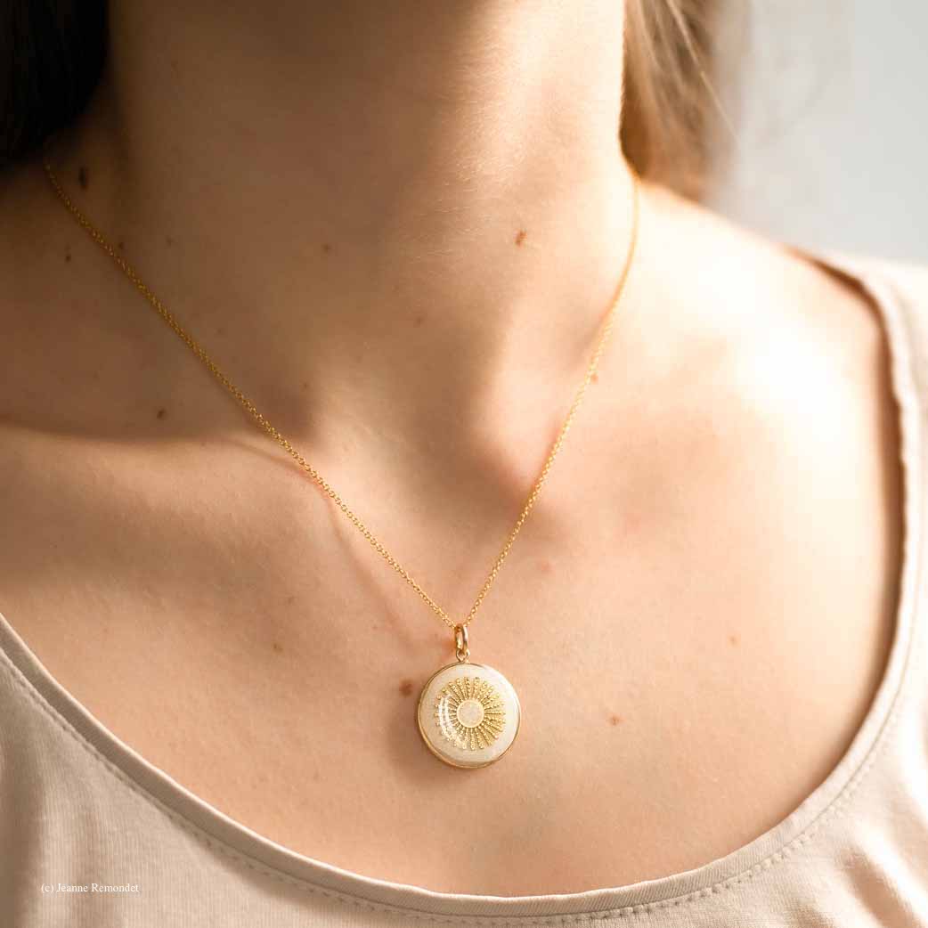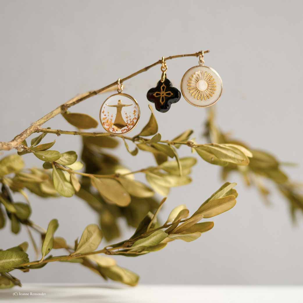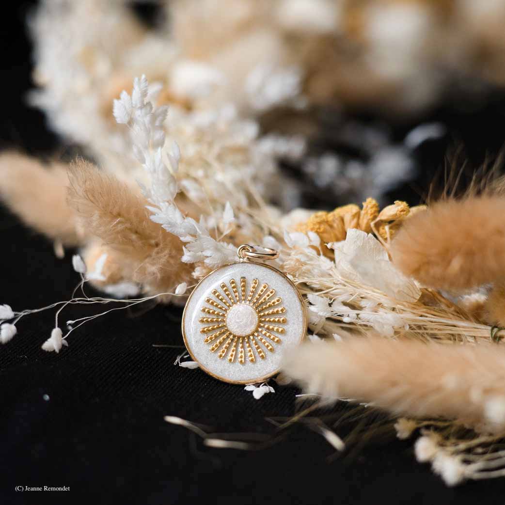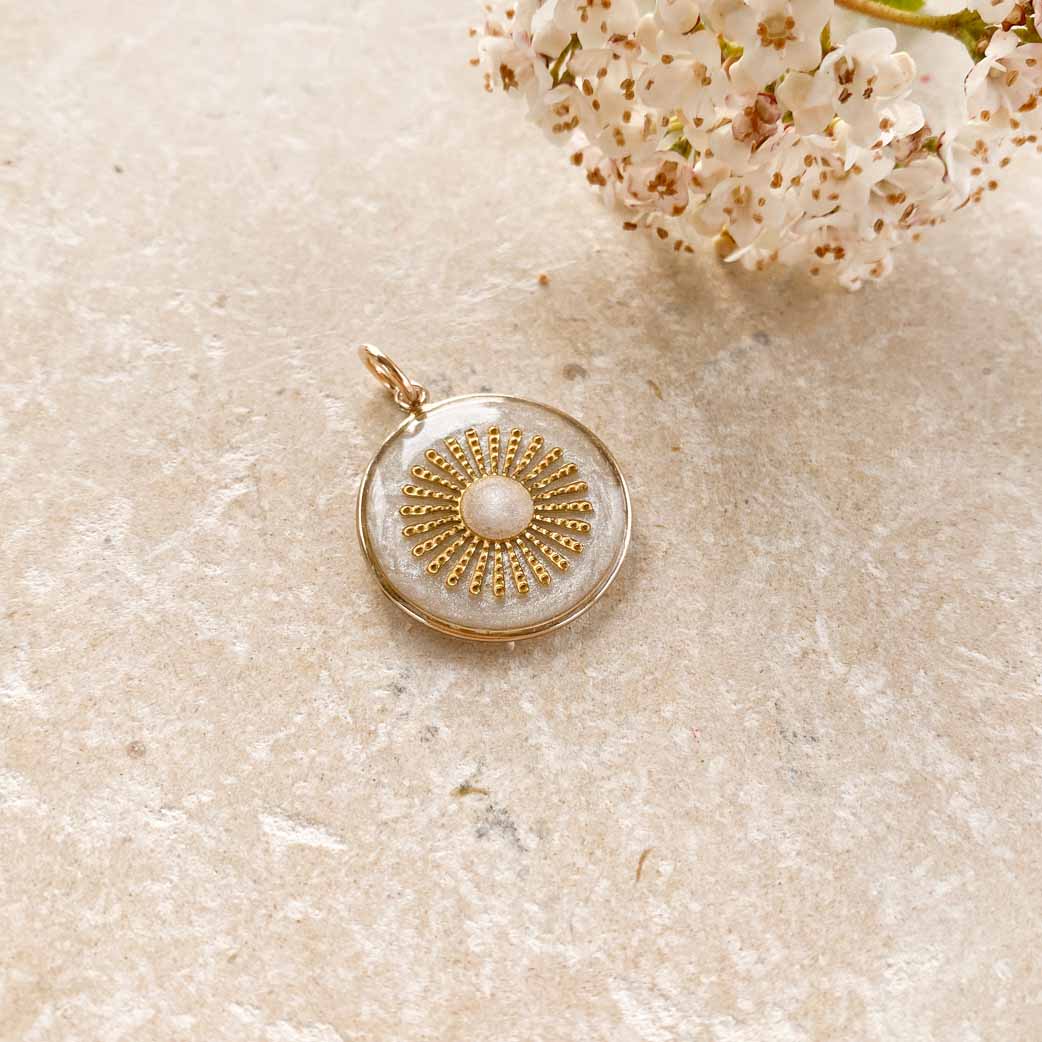 Cerchio gold filled (vedi FAQ per i materiali), piccolo ostensorio e mica perlata. Venduto senza Catenina.
