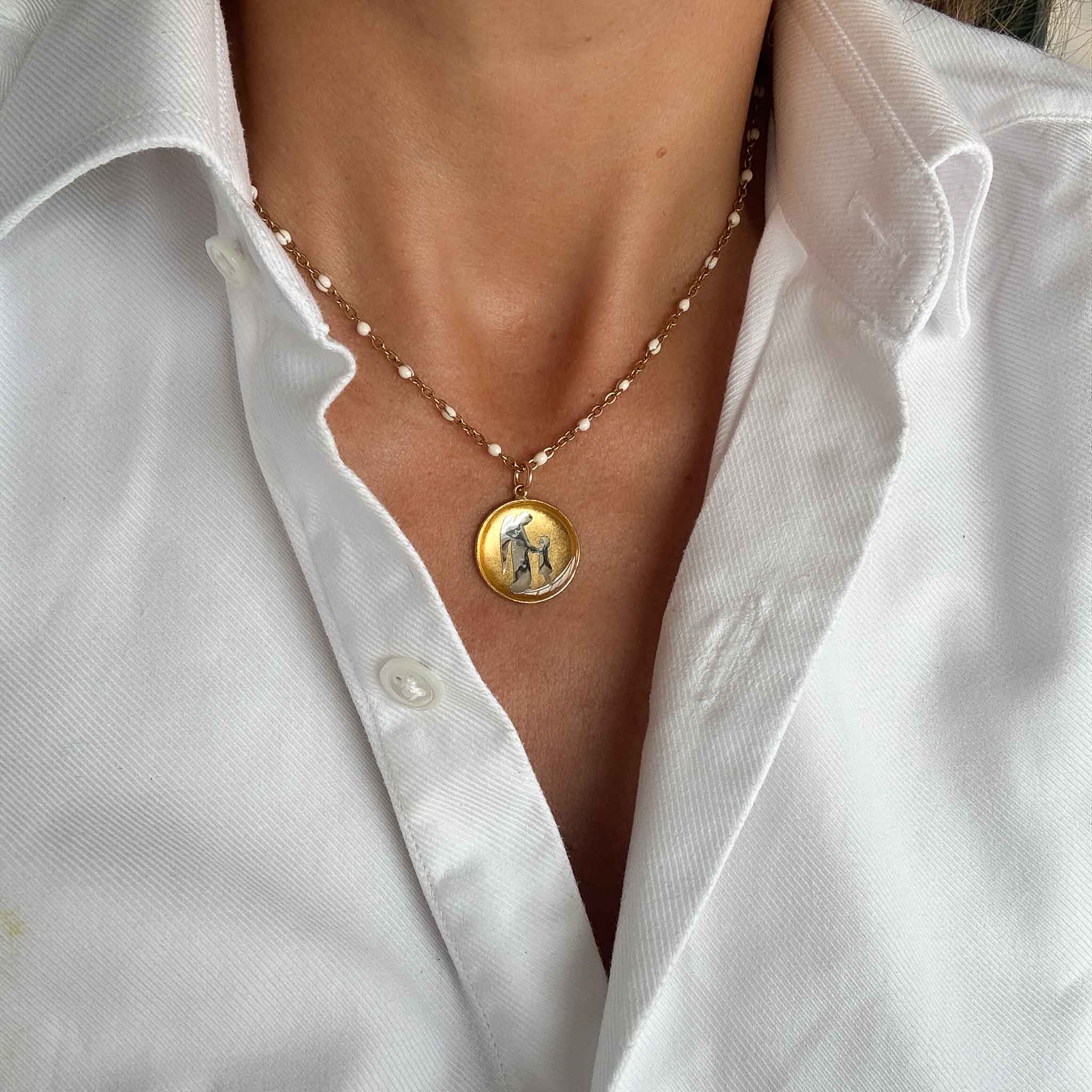 Gioiello fatto a mano, cerchio gold filled, foglia d'oro 24 carati e sagome di angeli e bambini in argento. Il modello che indosso sulla catenina a grana bianca è il MODELLO 20 MM, ovvero la misura classica. Lo stesso anche a sinistra nella foto con le due medaglie. È disponibile anche nel modello 16 MM (a destra nella foto) per un gioiello più discreto o per un bambino piccolo. Per per preservare la brillantezza dei vostri gioielli, è consigliabile mantenerli lontano da acqua e profumi e conservarlo in un luogo asciutto. quando non lo si indossa.