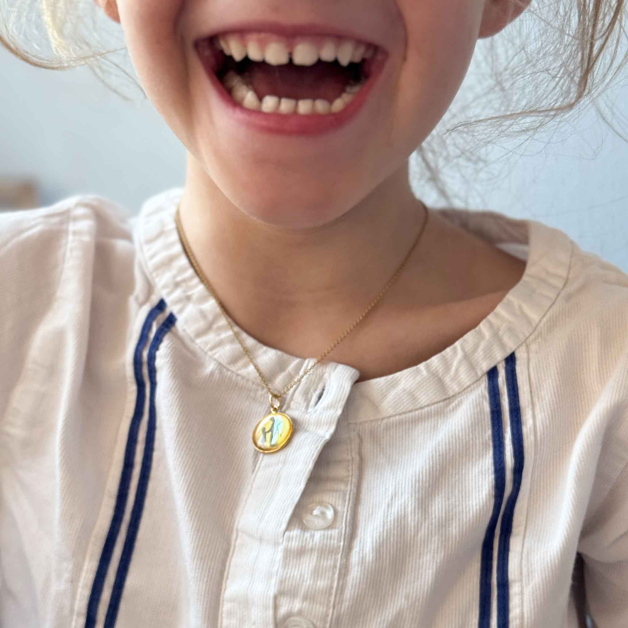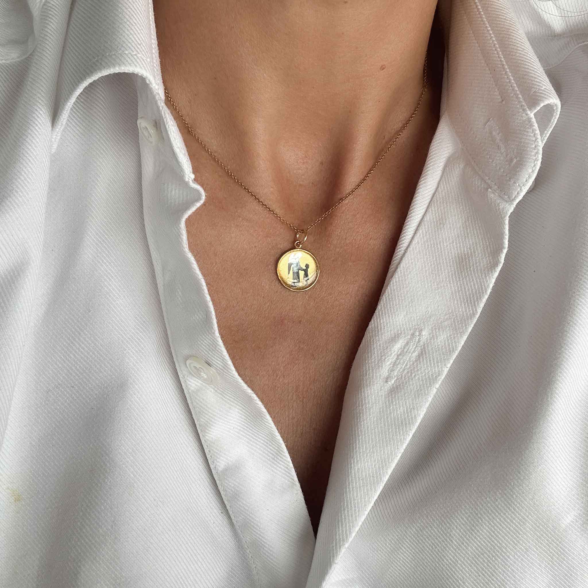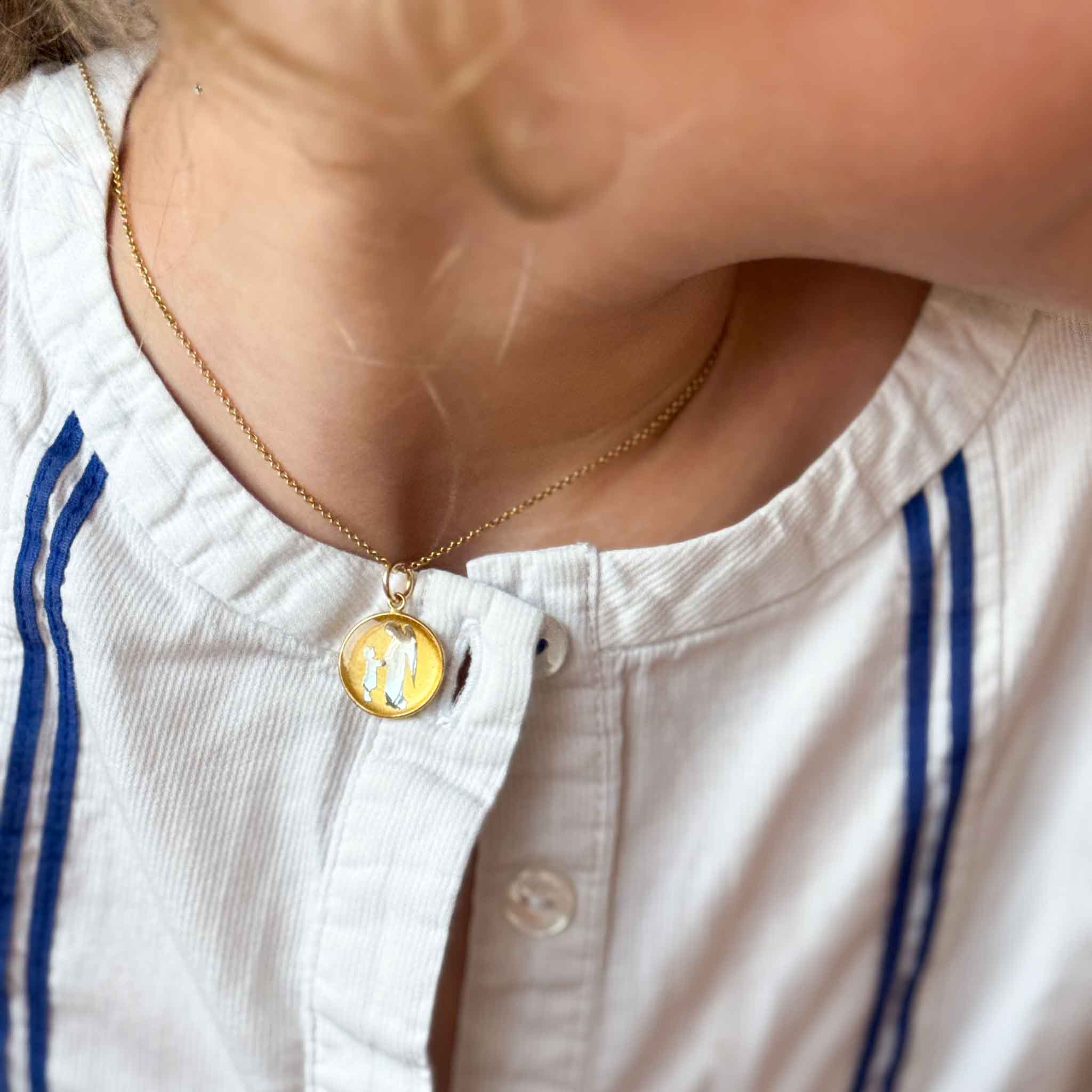 Gioiello fatto a mano, cerchio in gold filled, foglia d'oro 24 carati e argento e sagome dell' angelo e del bambino argentate. Questo modello, indossato da me e da mia figlia di cinque anni, è il MODELLO 16 MM, perfetto per un gioiello discreto o per un bambino. Per una medaglia più grande e classica, si può prendere in considerazione il MODELLO 20 MM. Per garantire la brillantezza del vostro gioiello, consigliamo di proteggeterlo dall'acqua e dai profumi e conservarlo in una custodia quando non lo indossate. quando non lo si indossa.