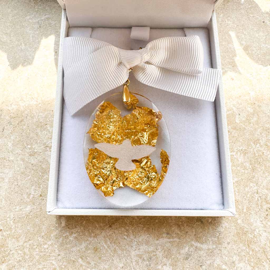 La medaglia è alta 7 cm e realizzata in resina trasparente, con gancetto, anellino e spilla placcati in oro 24 carati. È accompagnata da un grazioso bigliettino d'auguri. Naturalmente si raccomanda che quando i bambini sono abbastanza grandi da afferrare un oggetto, questo sia più alto di quanto possano raggiungere.