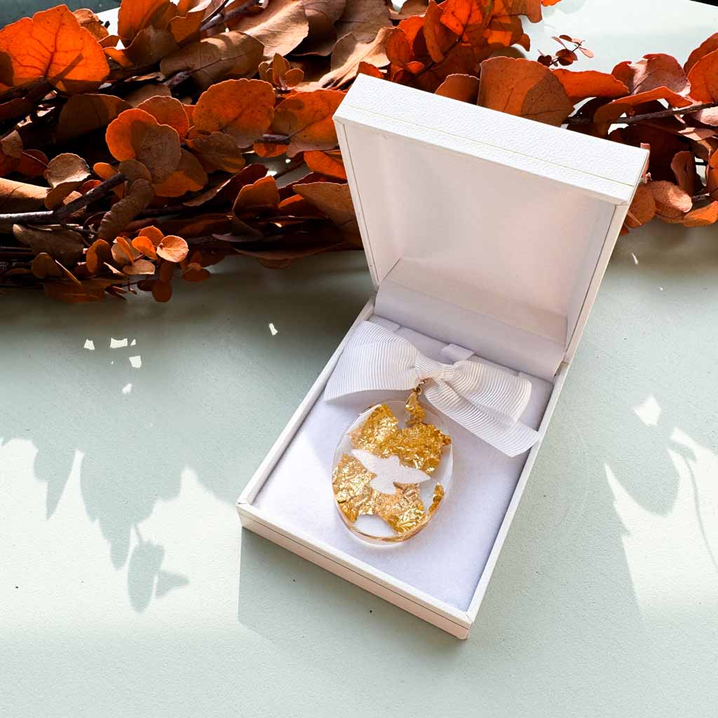 Ogni nascita è un miracolo. Uno sconvolgimento e una gioia. Il desiderio di porre un segno di benedizione accanto a questa nuova vita è ovvio. Naturalmente, ai genitori verranno offerti mille e più piccoli oggetti di abbigliamento che svaniranno rapidamente. Ho voluto offrire qualcosa che durasse nel tempo, per tutte le età: qui una colomba perlata su un letto d'oro, una reinterpretazione della vetrata dello Spirito Santo nella Basilica di San Pietro a Roma. Questo motivo è disponibile anche in versione gioiello suoro o argento.