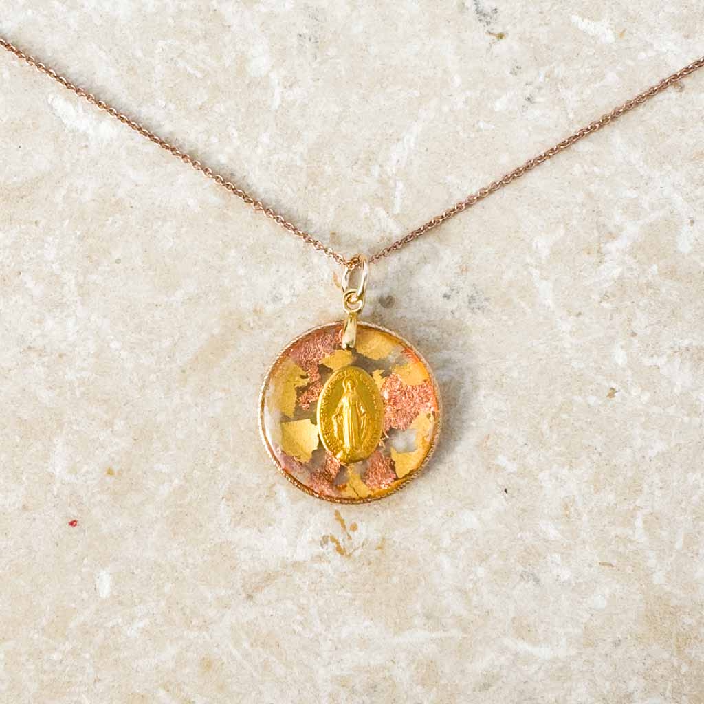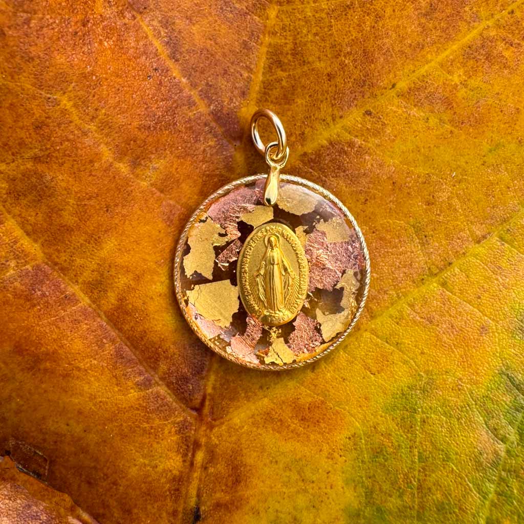 Uno dei miei piaceri è quello di sublimare la medaglia miracolosa. È come se ciò che creo intorno ad essa raccontasse la storia di una delle sue grazie particolari. Questo modello è la storia di una medaglia radiosa. Sembra che trafigga lo spazio con l'intensità della sua luce, l'oro e il rame liberamente combinati, incendiandosi a vicenda. Ogni medaglia sarà leggermente diversa, ma con lo stesso spirito, perché questa è una creazione della mano e del cuore umano, non il lavoro senza vibrazioni di una macchina. Spero che portare questo fuoco al collo conquisti il vostro cuore e la vostra anima. Che la vita, piena di amore infinito, sia infuocata!
