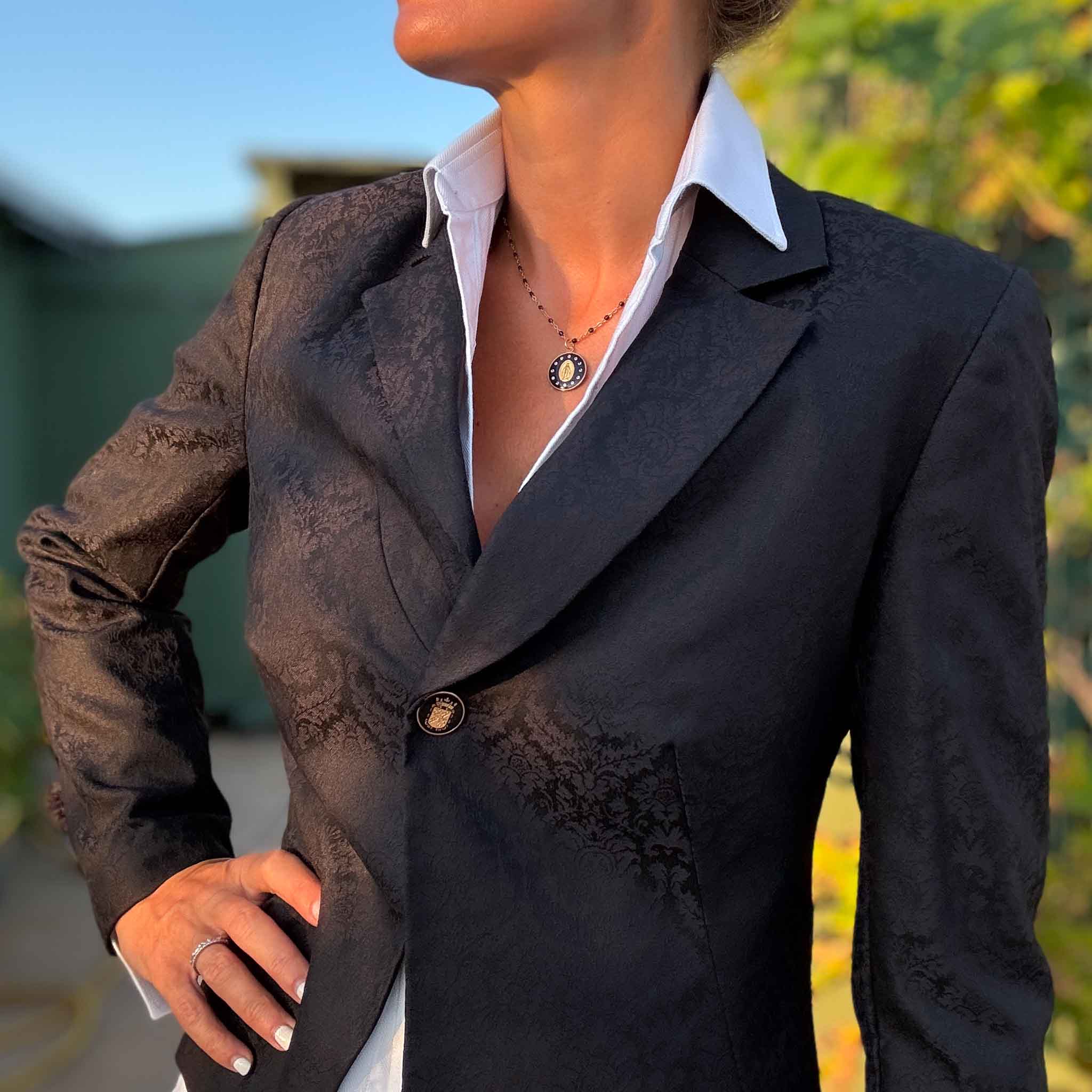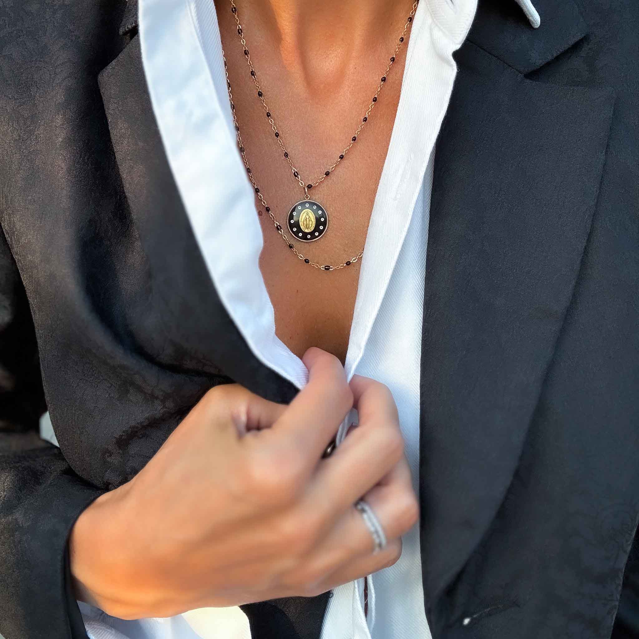 La versione blu di questo gioiello è la mia medaglia più venduta a Notre-Dame de Paris. Poiché amo la grande eleganza e modernità del nero, eccolo nella sua nuova veste che fa cantare la medaglia miracolosa e i dodici brillanti che la circondano. Penso anche che questo colore nero permetta di abbinare un gioiello dal profondo senso di devozione e protezione a un look femminile, sia che si tratti di un little black dress che di un look più rock.