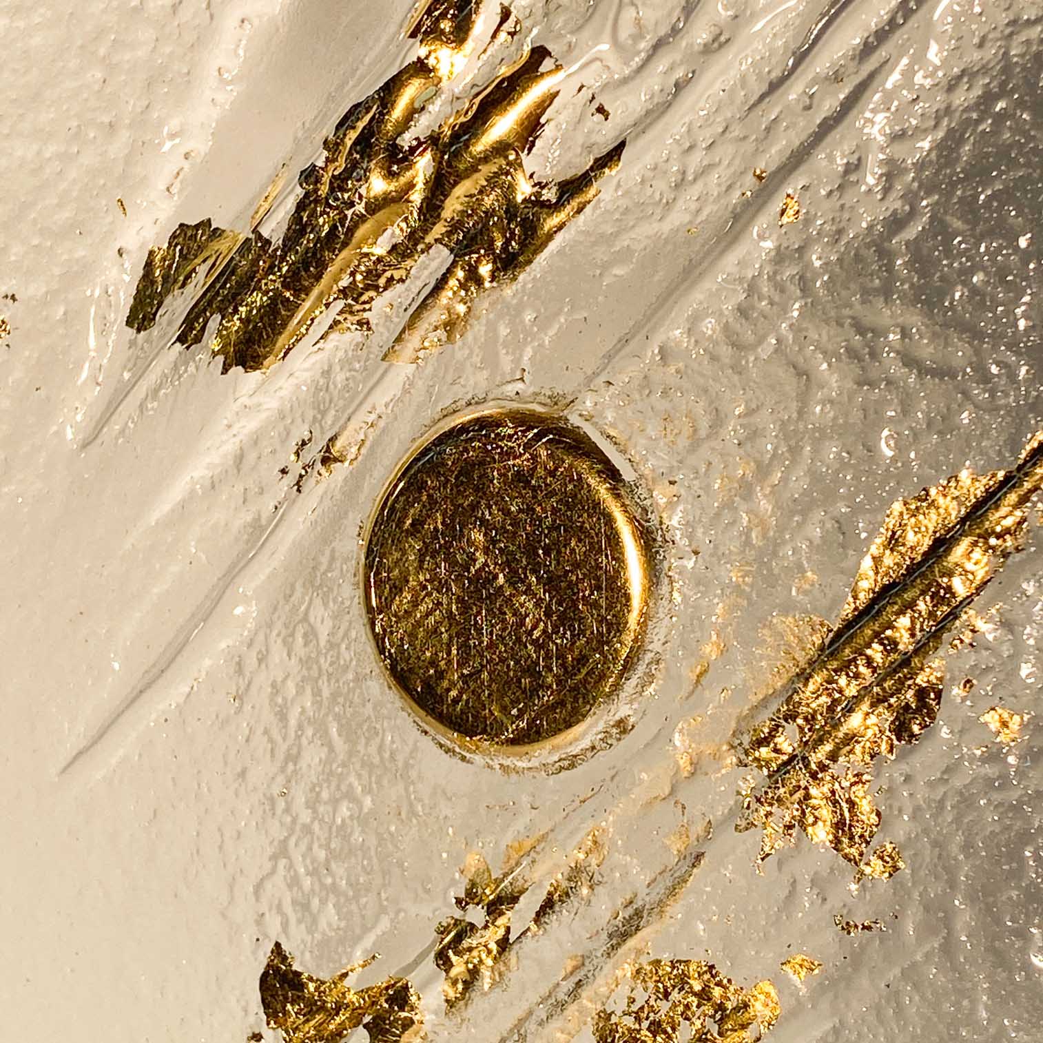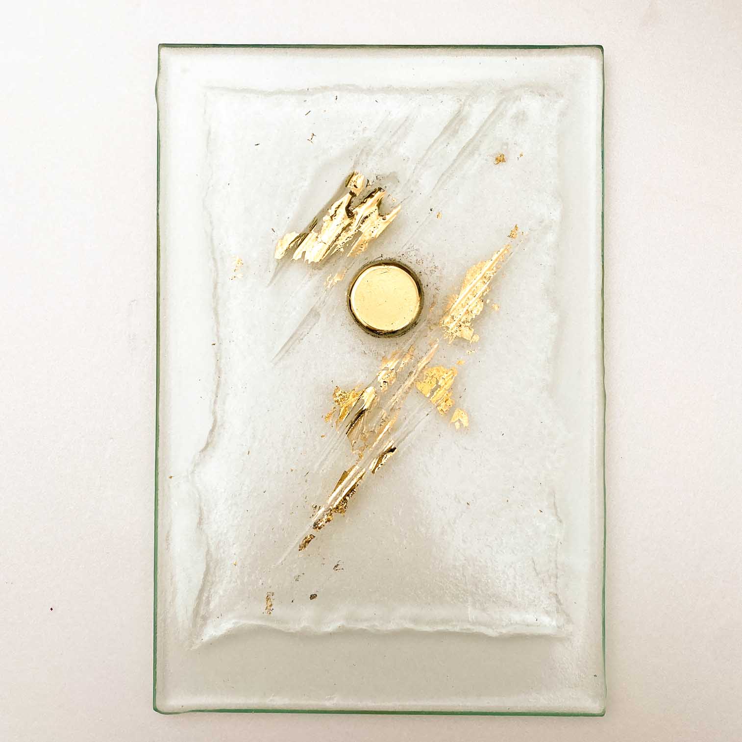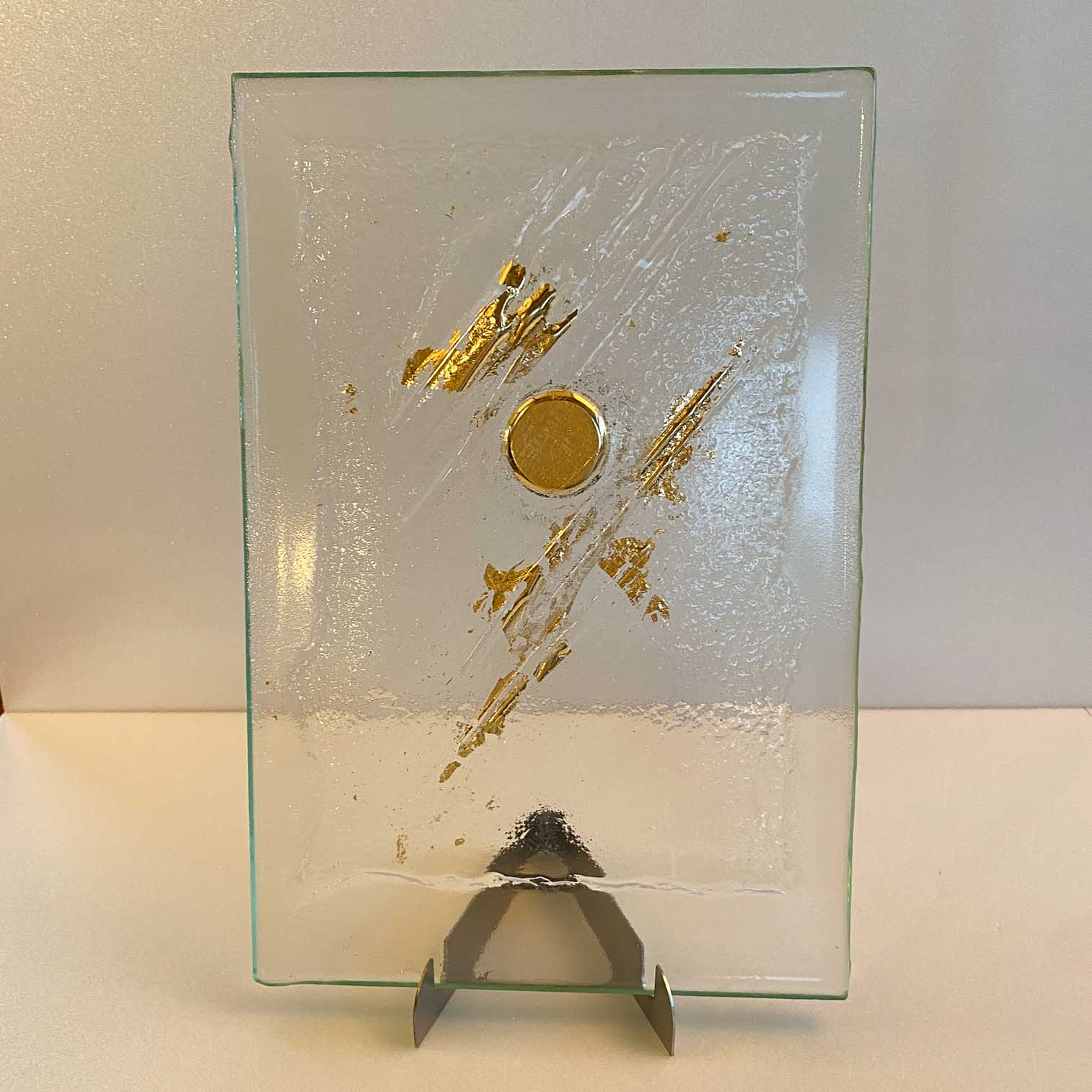 Questa icona di vetro è un pezzo unico che ho scolpito a mano e termoformato dal vetro a oltre 800 gradi. È impreziosita da foglia d'oro 24 carati. Viene spedita in una custodia speciale protetta e viene fornita con un supporto neutro in acciaio inossidabile per consentirle di stare in piedi, oltre a un certificato di autenticità dell'opera.