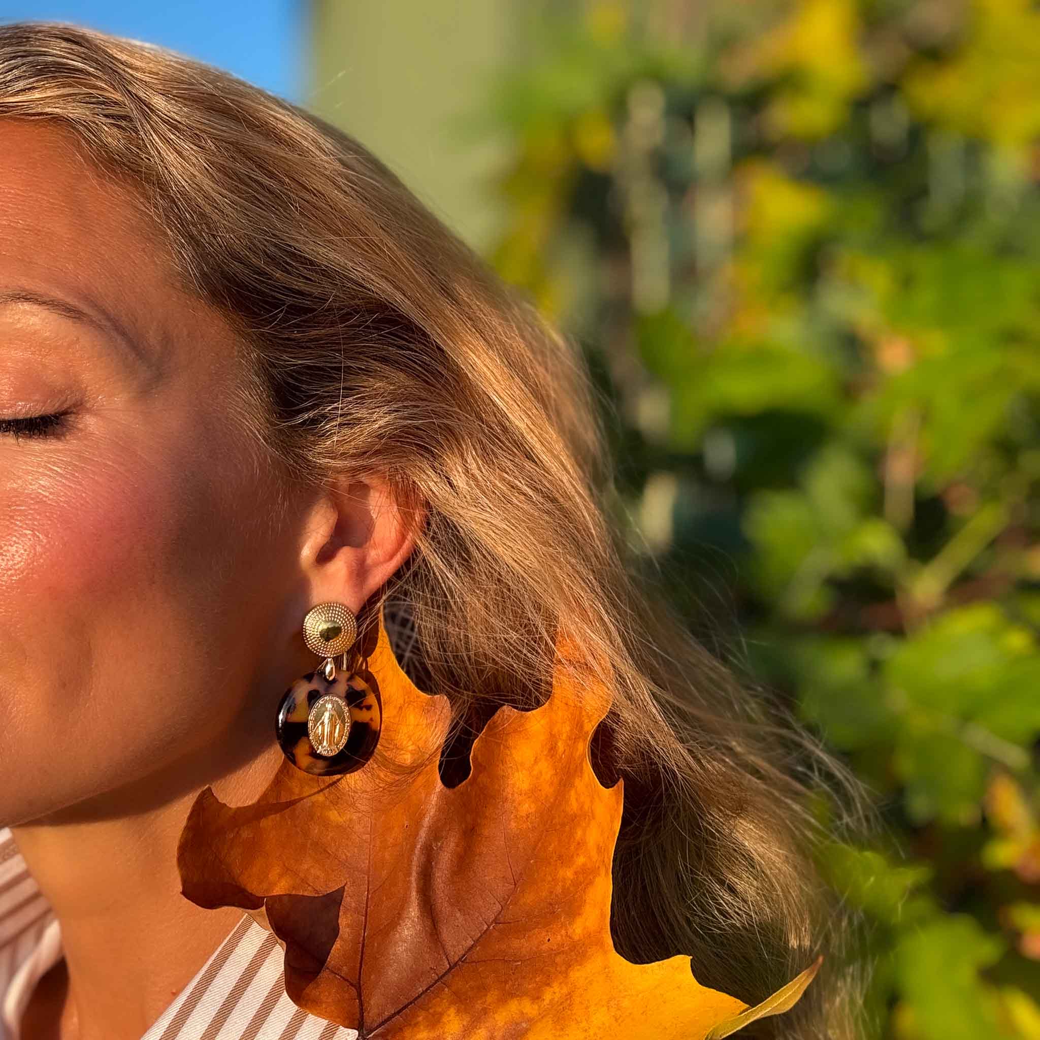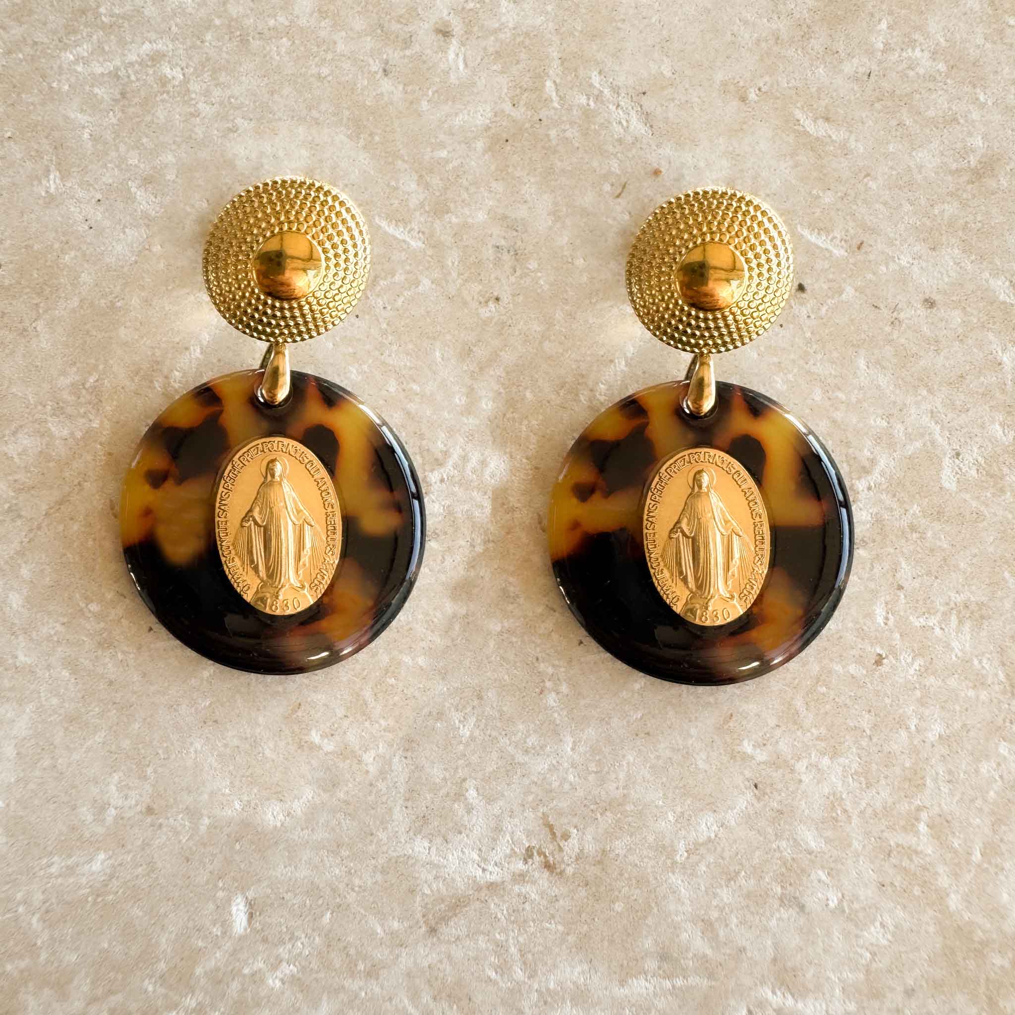 Bijou réalisé à la main, sequin en imitation écaille de 3 cm de diamètre (aucune tortue n’est brutalisée ! ), médaille miraculeuse de la rue du Bac. Belière et anneau en plaqué or 3 microns, clous d'oreilles ouvragés en acier inoxydable (le modèle n'est pas adaptable en clips). La boucle a une hauteur totale de 5 cm et est extrêmement légère à porter au long de la journée, c'est impératif à mon sens de garder ce confort et de ne jamais avoir une enclume à l'oreille ;-) Comme le montrent les photos, les sequins sont tous légèrement différents, gardant ainsi le charme de l'écaille véritable.