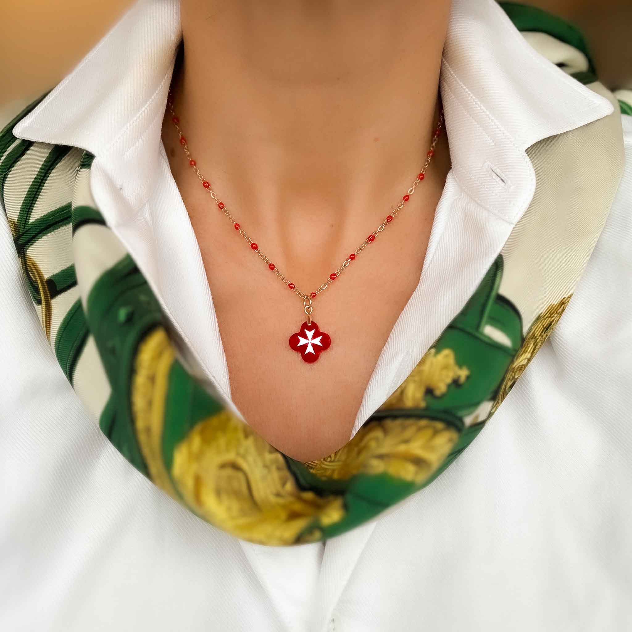 Une petite croix incandescente de ferveur. La blancheur de la croix de Malte rayonne sur un rouge que j'aime particulièrement. La forme ancienne du quadrilobe donne à ce pendentif un sentiment d'éternité. Cette petite croix (1,7 x 1,7 cm) est présentée ici sur la chaîne simple rouge sainte Reine.