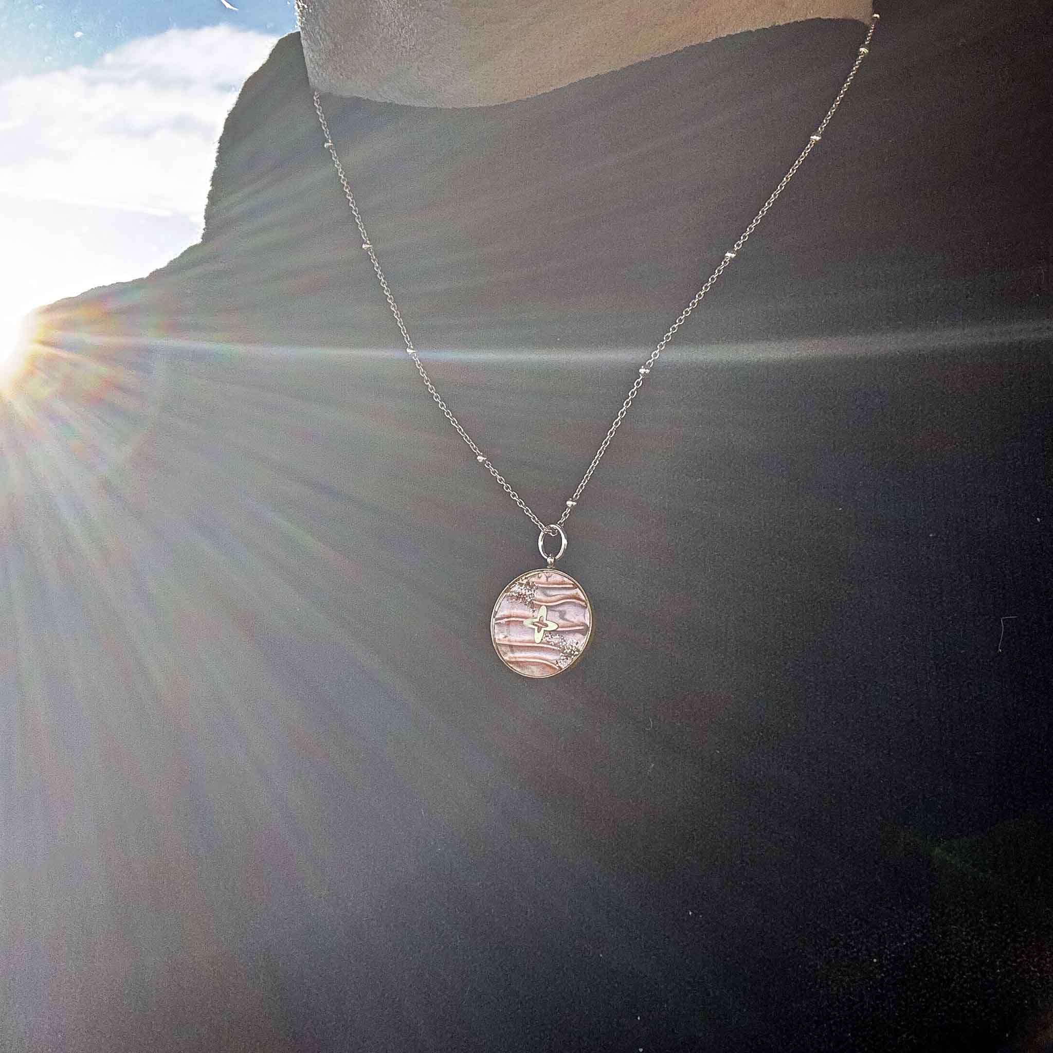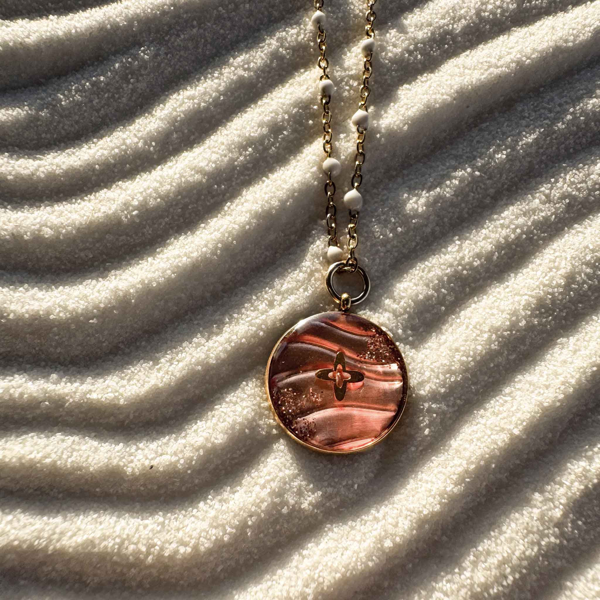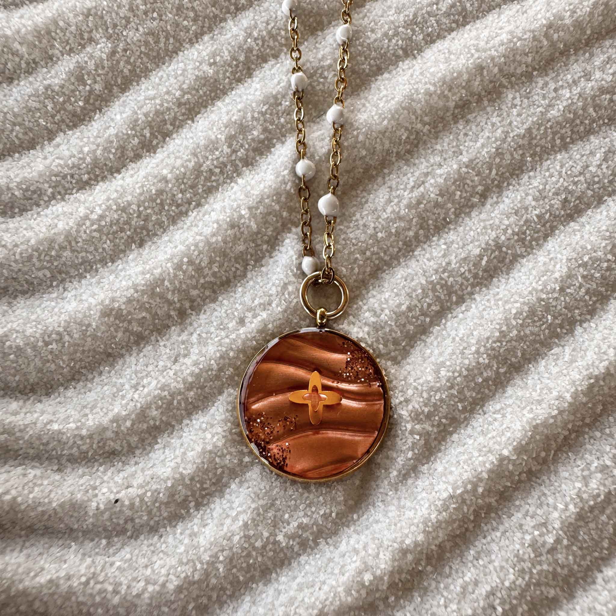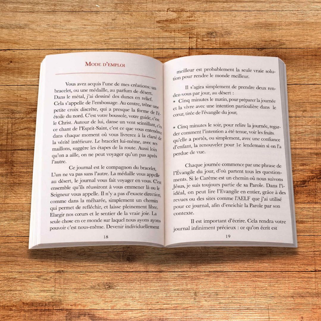 La médaille est une petite sculpture de désert en embossage : une feuille de cuivre sculptée en relief qui représente les ondulations du sable du désert. Au centre, une petite croix lumineuse rayonne, traversée d'un souffle scintillant. Au dos de la médaille, le nom du Christ est gravé à la main en araméen, un mot à la fois fort et discret comme un secret. À chaque fois que votre regard se posera sur la chaleureuse lumière de cette médaille, vous vous souviendrez que Dieu vous attend.