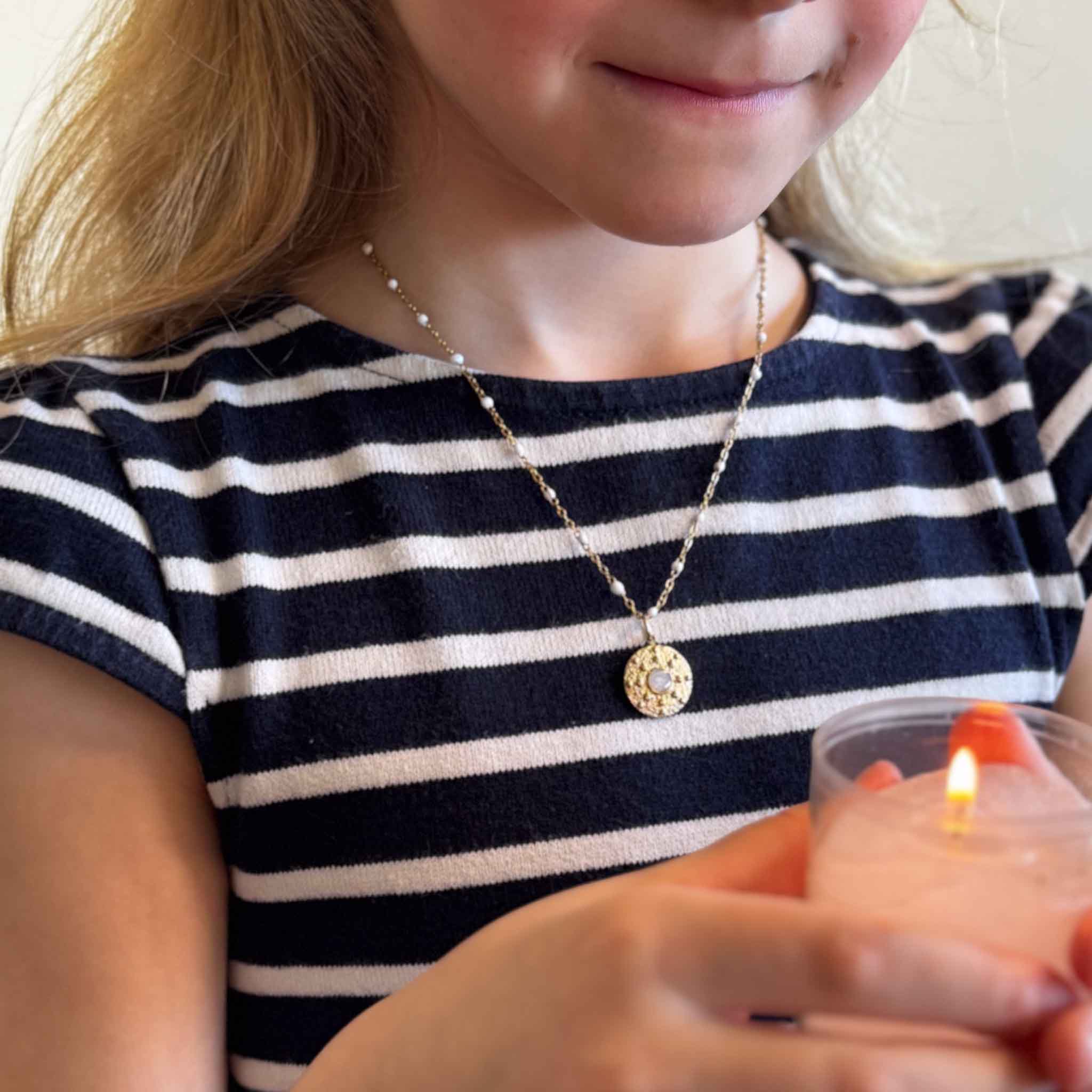 Portée sur la chaîne courte sainte Blandine sur ma Maximilia de 6 ans (robe marinière)