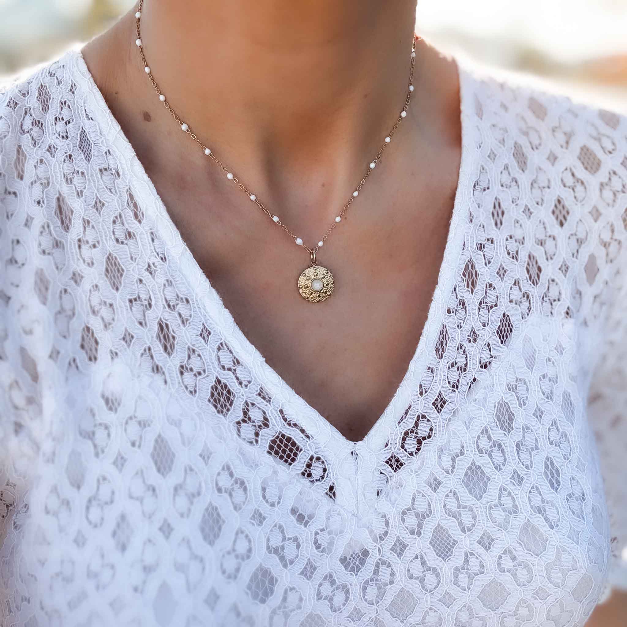 Portée sur la chaîne courte sainte Blandine sur moi (robe blanche)